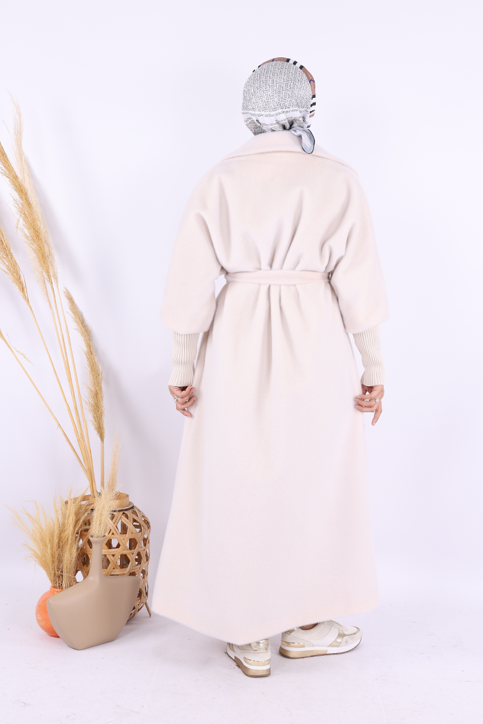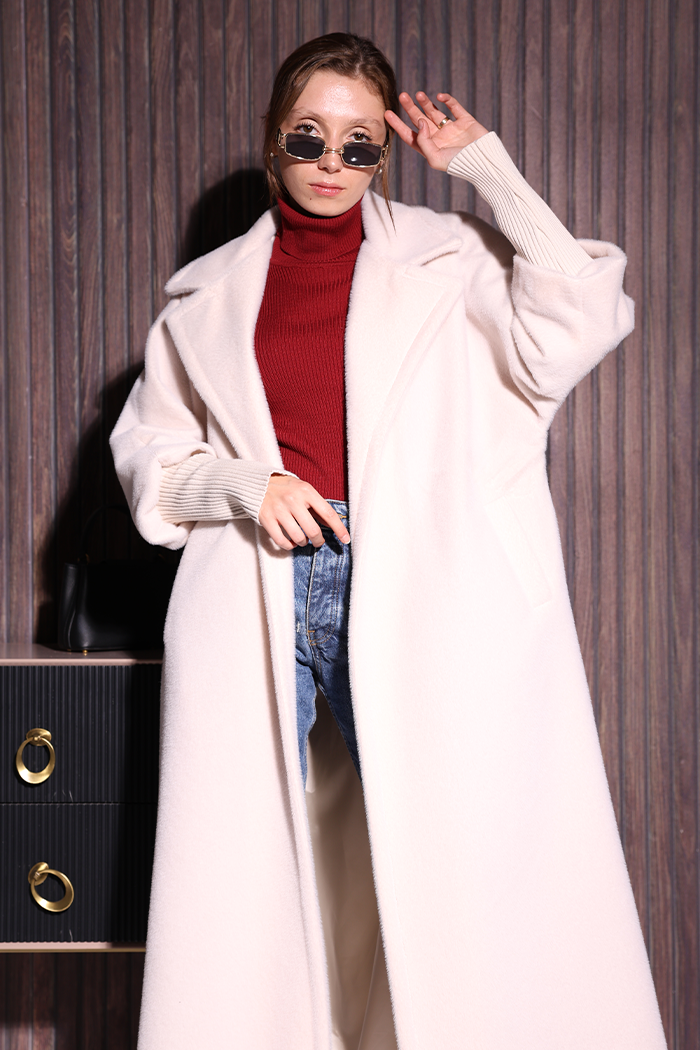 BEL KUŞAKLI YAKA TAŞ BROŞ DETAYLI UZUN KABAN: