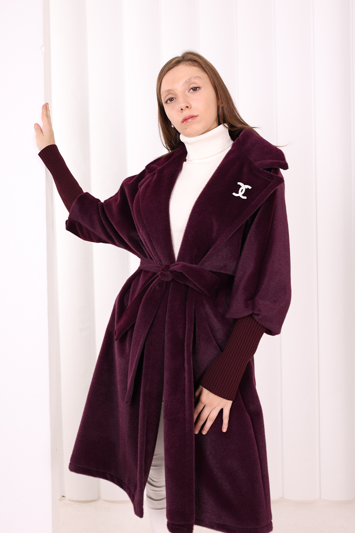 Bel Kuşaklı Yaka Taş Broş Detaylı Kaban 7874 Mor