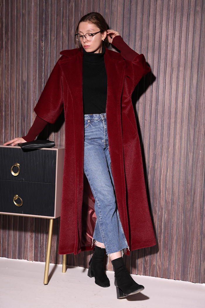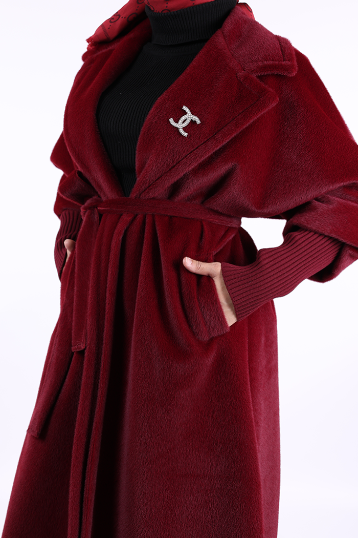 Bel Kuşaklı Yaka Taş Broş Detaylı Uzun Kaban 7923 Bordo