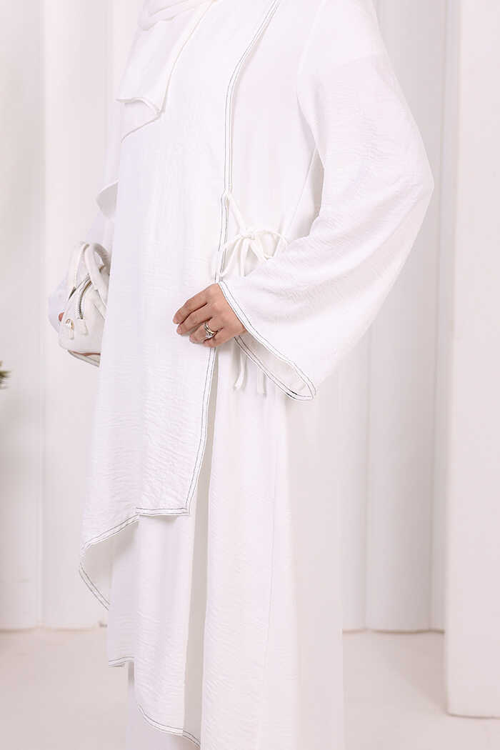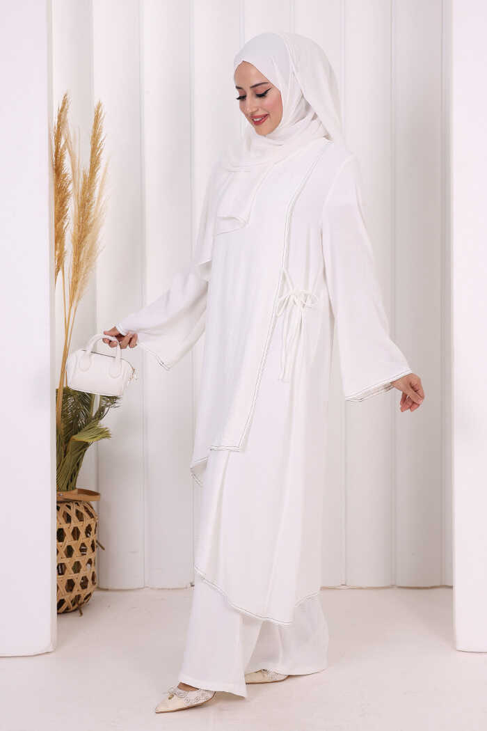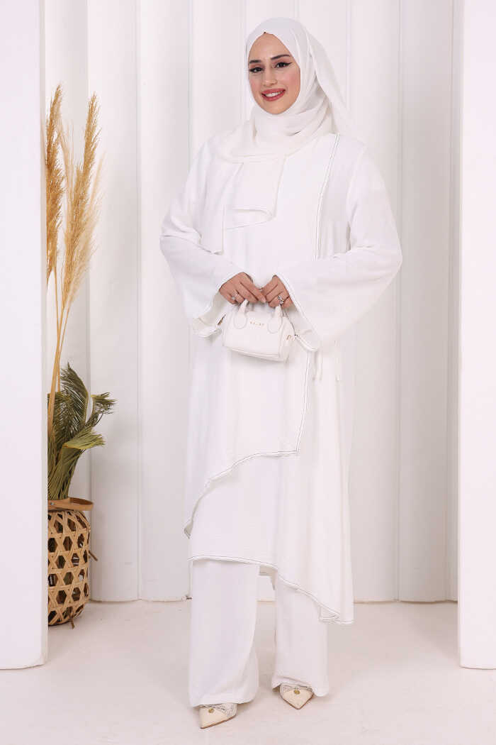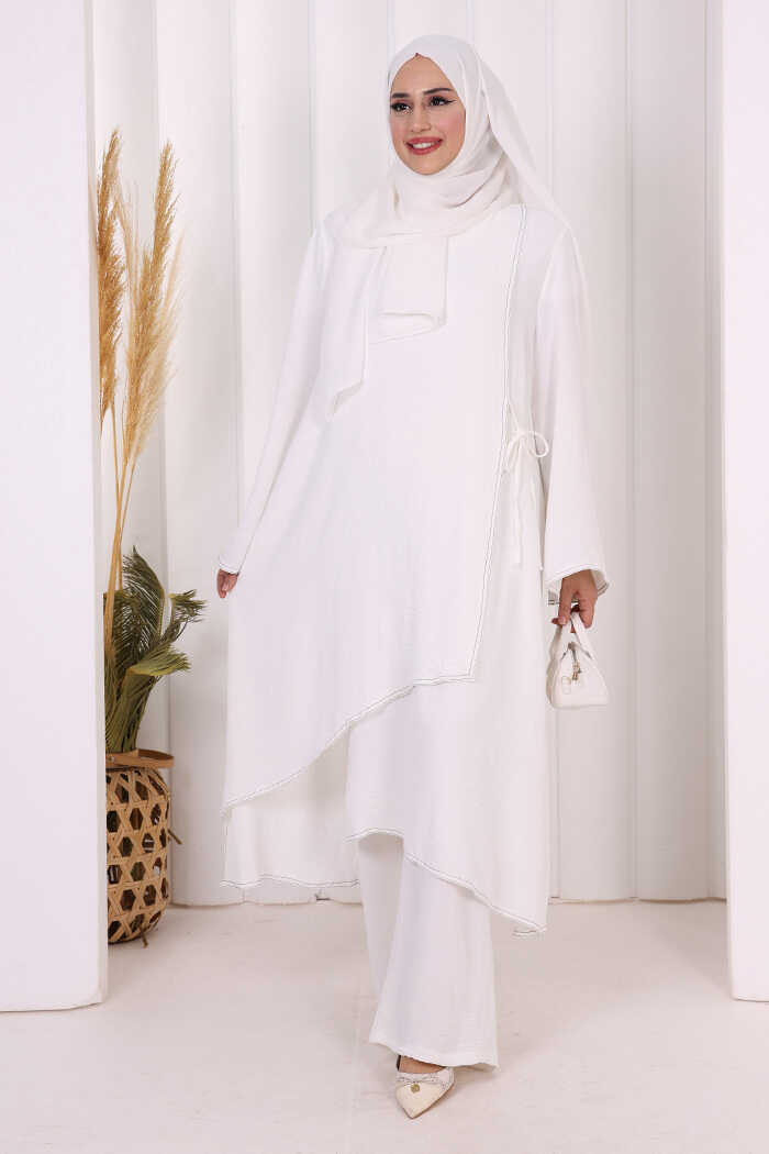 Biyeli Uzun Tunik Pantolon Takım 8005 Ekru
