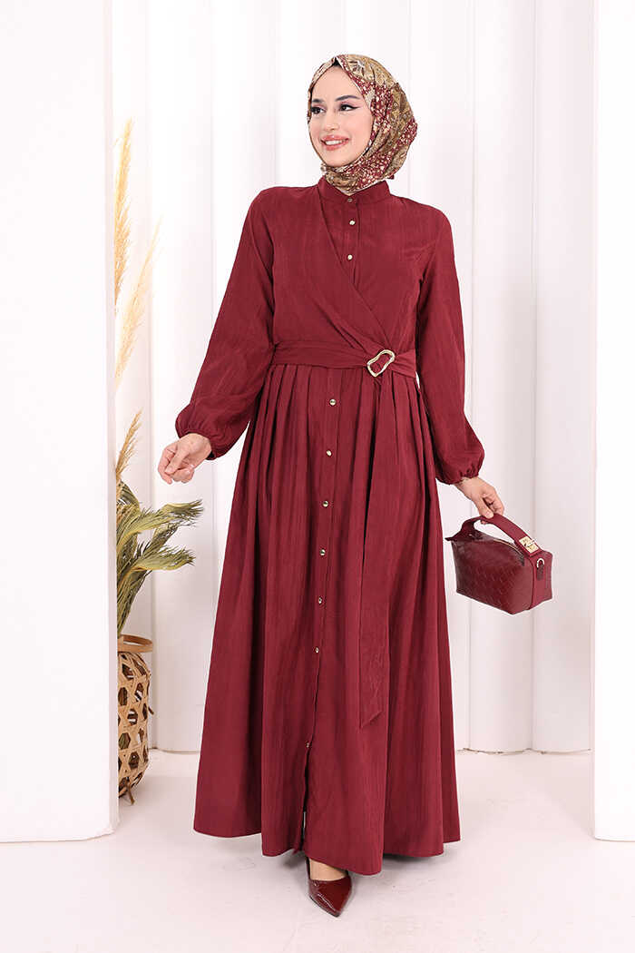 Broş Detaylı Boydan Düğmeli Elbise 7059 Bordo