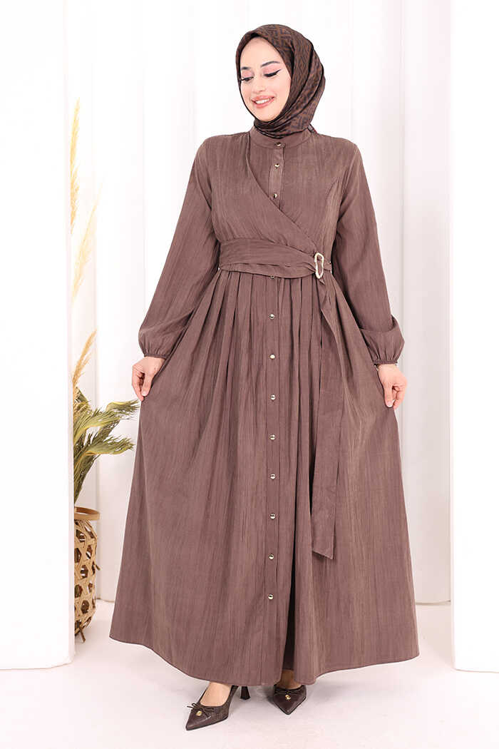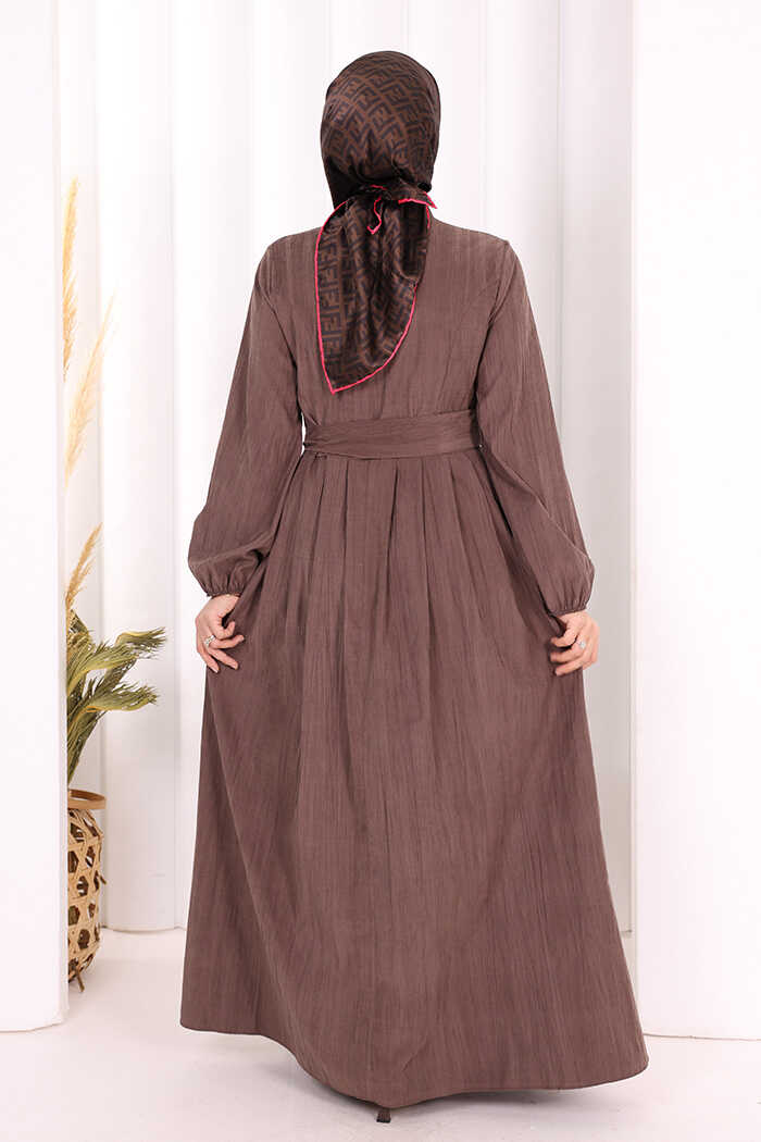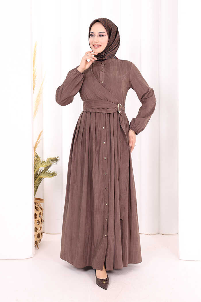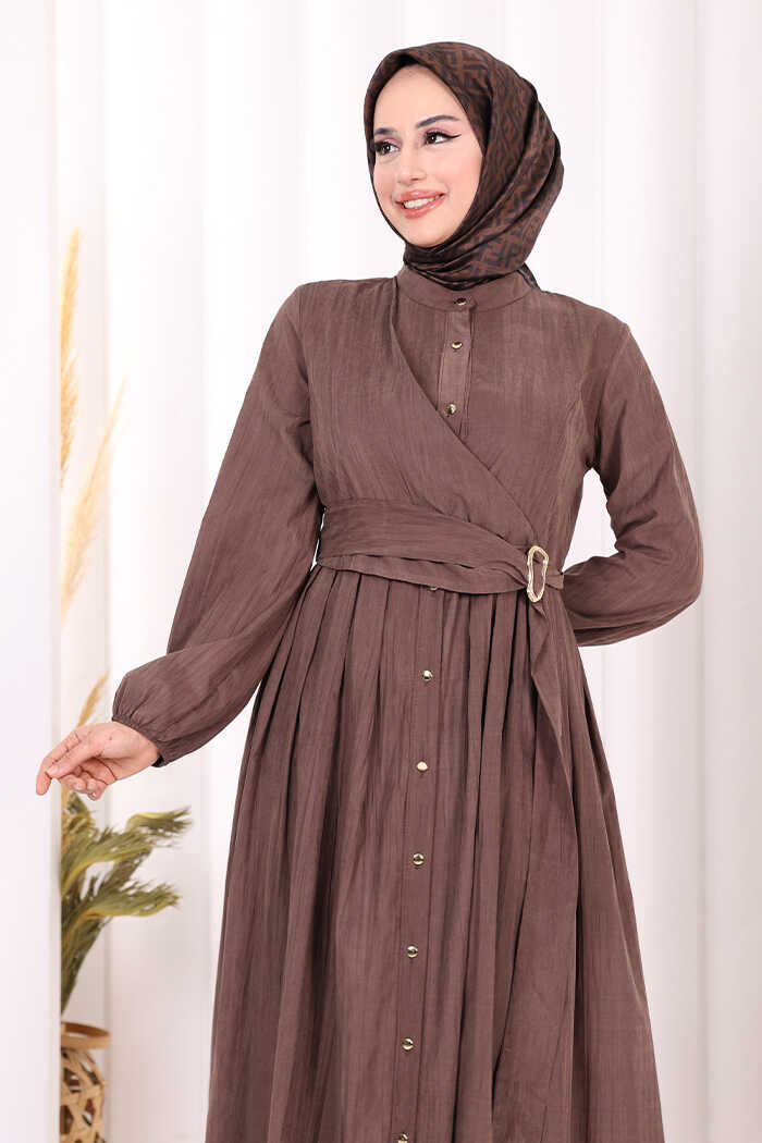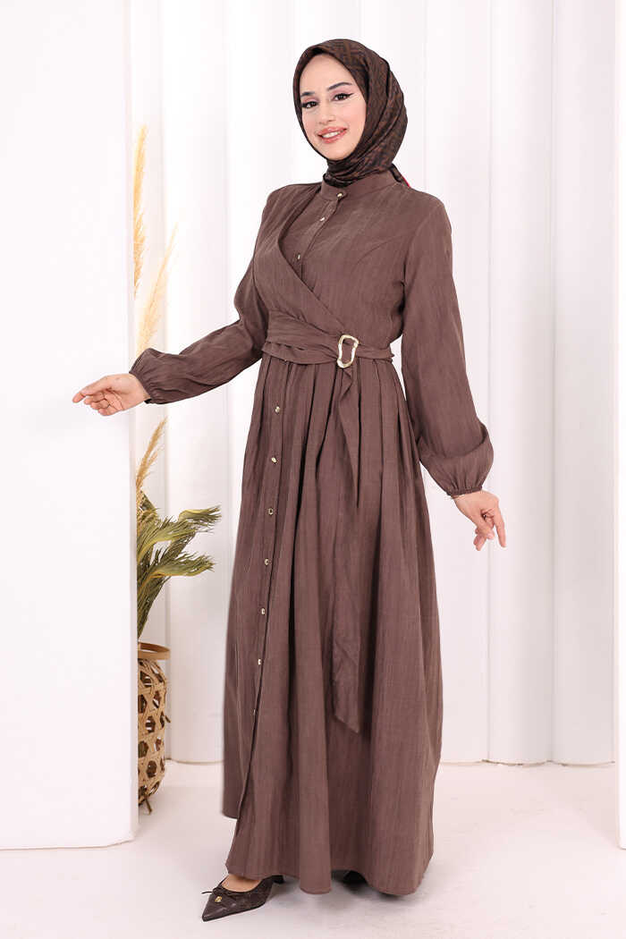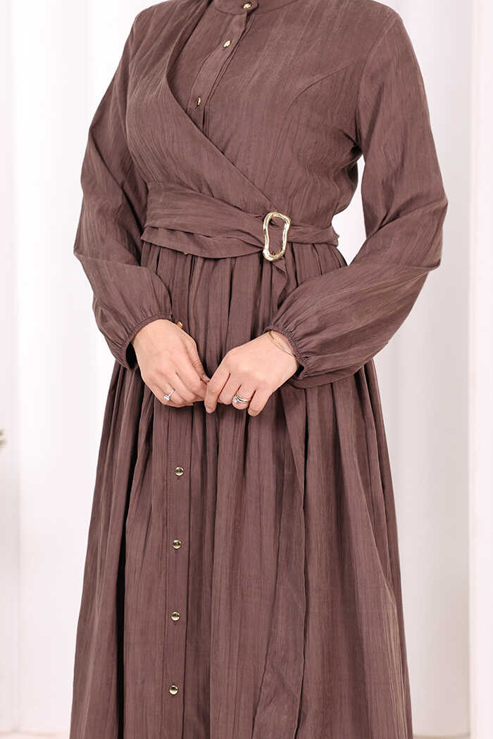 Broş Detaylı Boydan Düğmeli Elbise 7059 Kahverengi