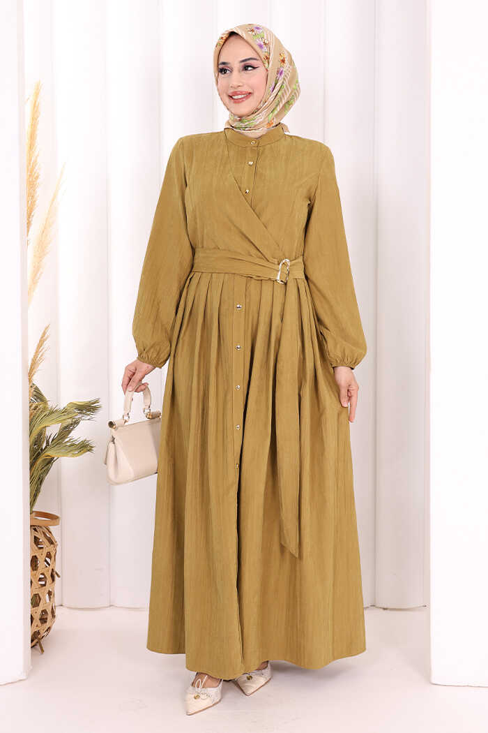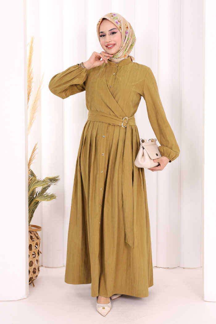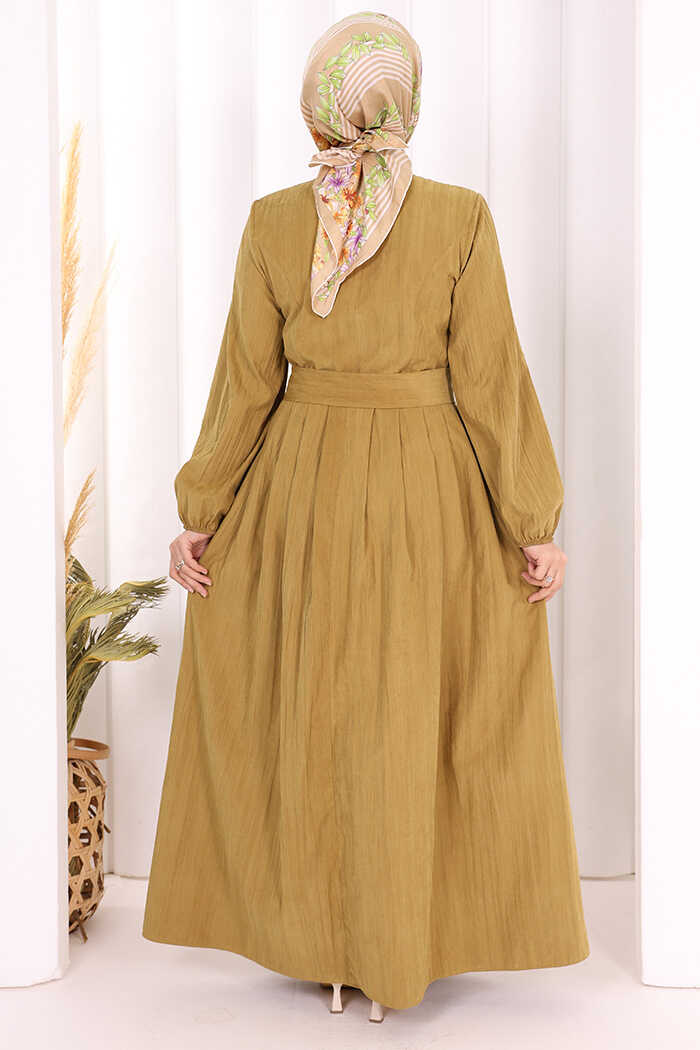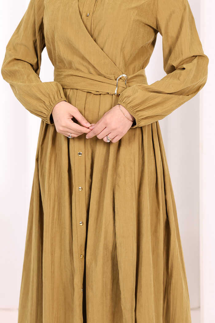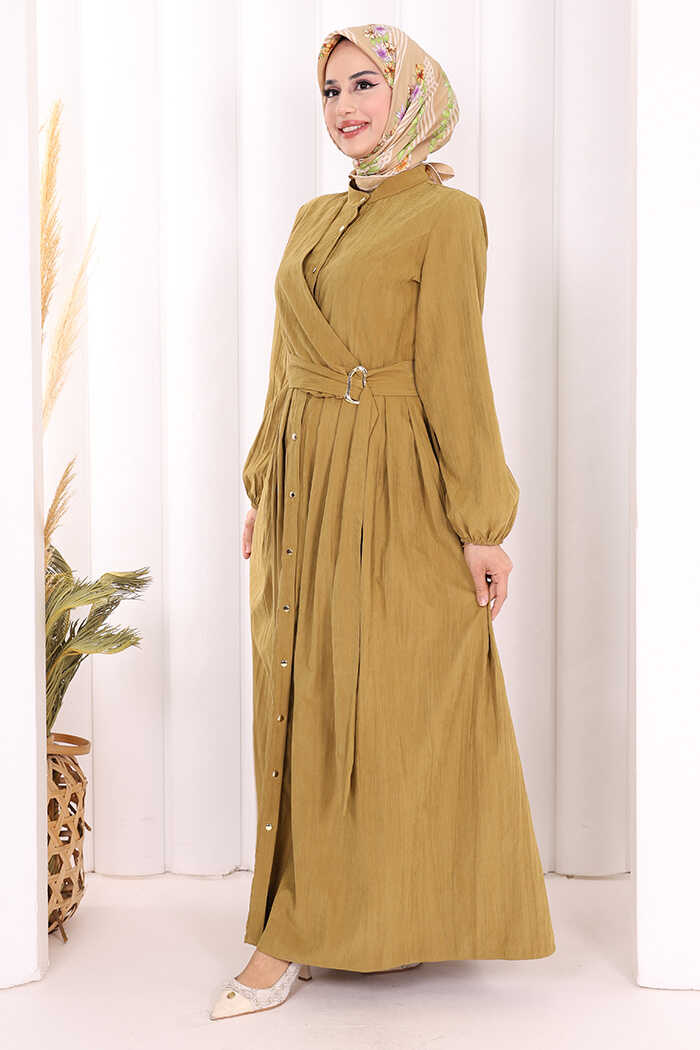 Broş Detaylı Boydan Düğmeli Elbise 7059 Yağ Yeşili
