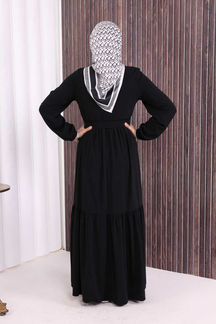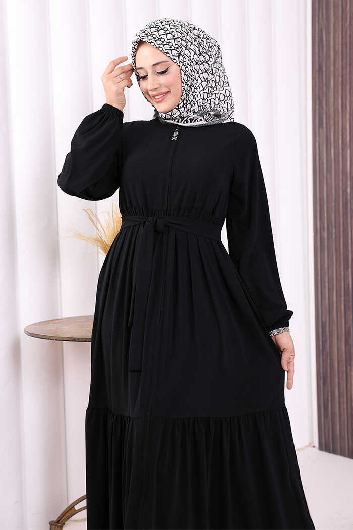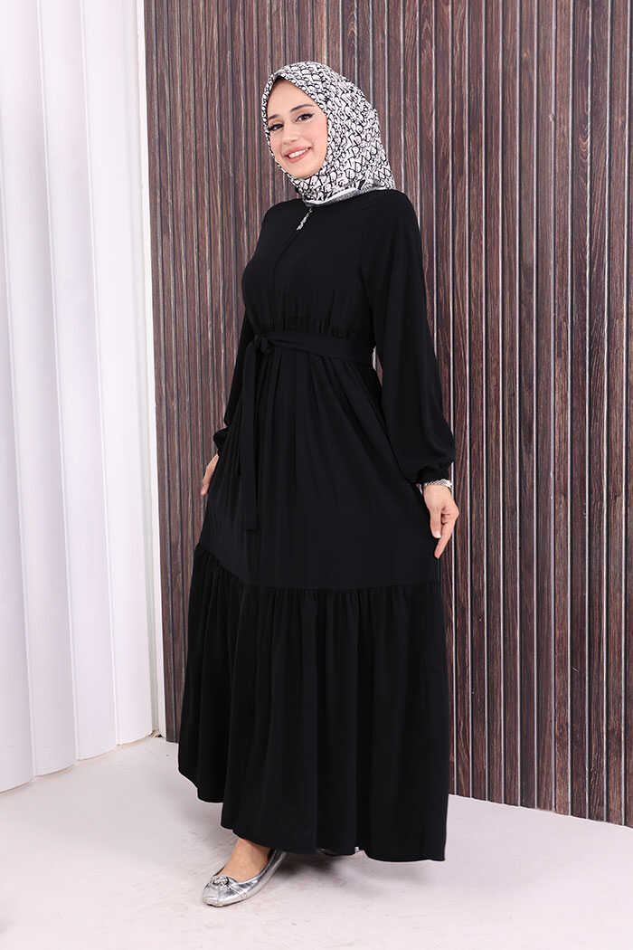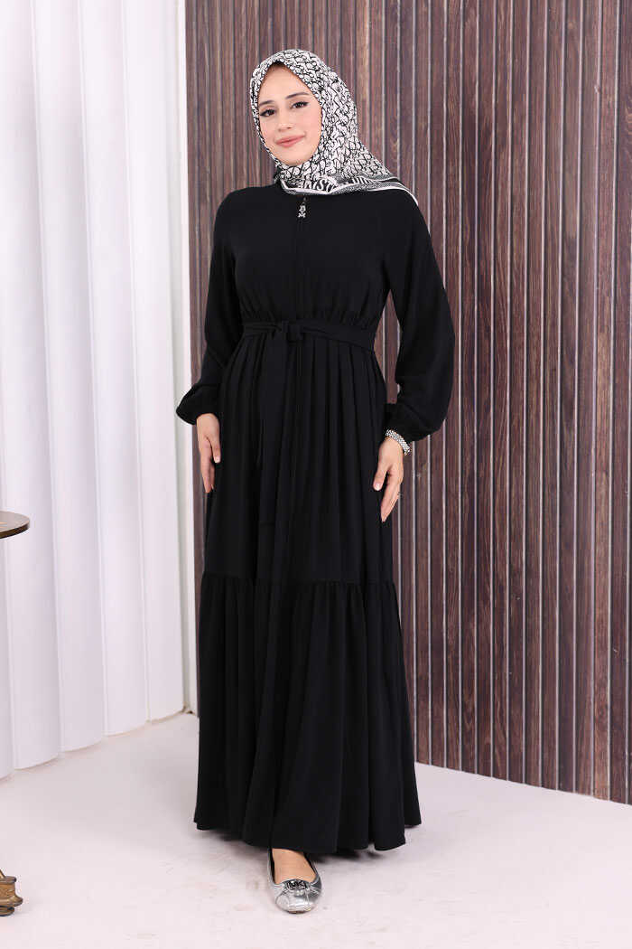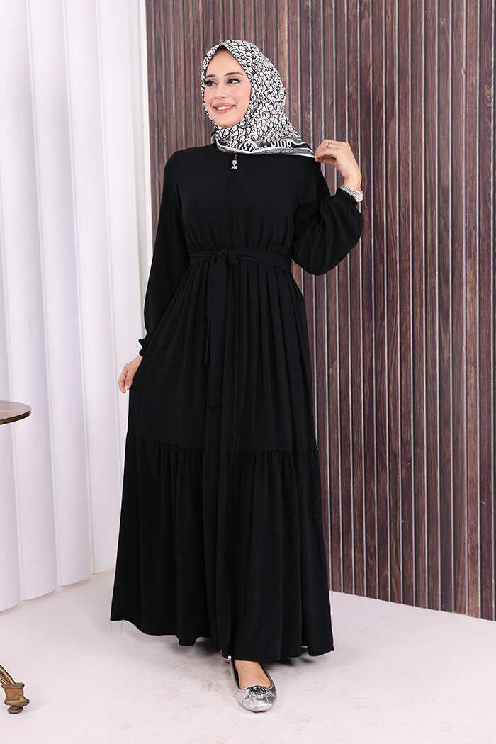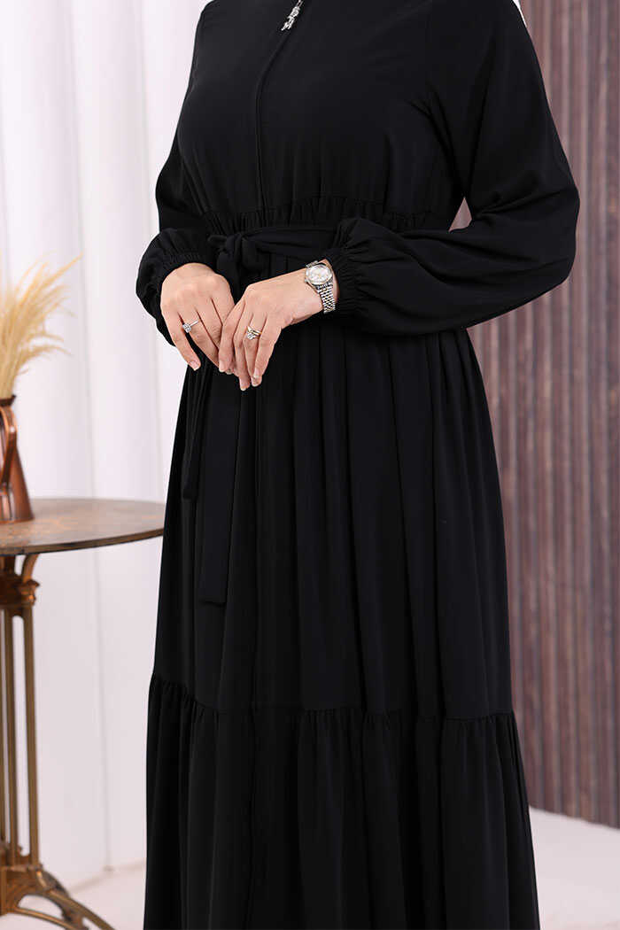Dubai Fermuarlı Kol Manşetleri Lastikli Fırfırlı Elbise 6001 Siyah
