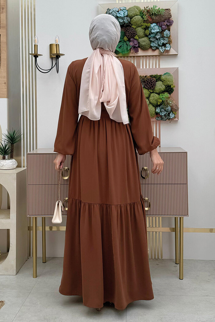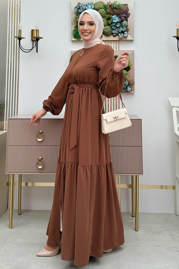 Dubai Fermuarlı Kol Manşetleri Lastikli Fırfırlı Elbise 6001 Taba