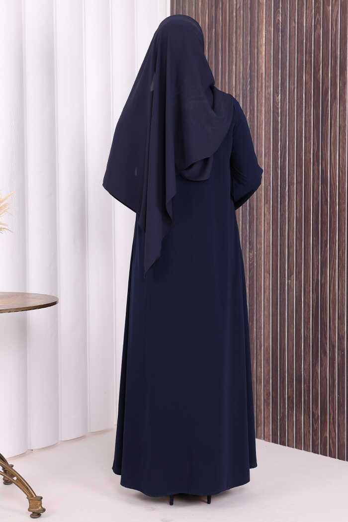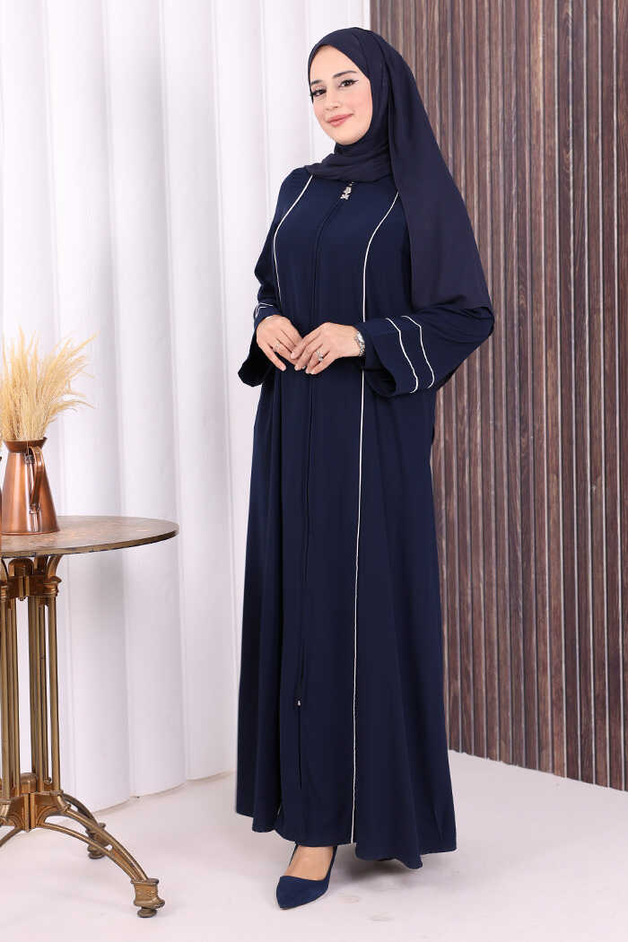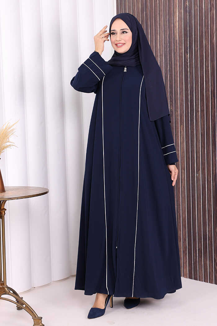 Çizgi Detaylı Boydan Fermuarlı Tam Boy Ferace 6011 Lacivert