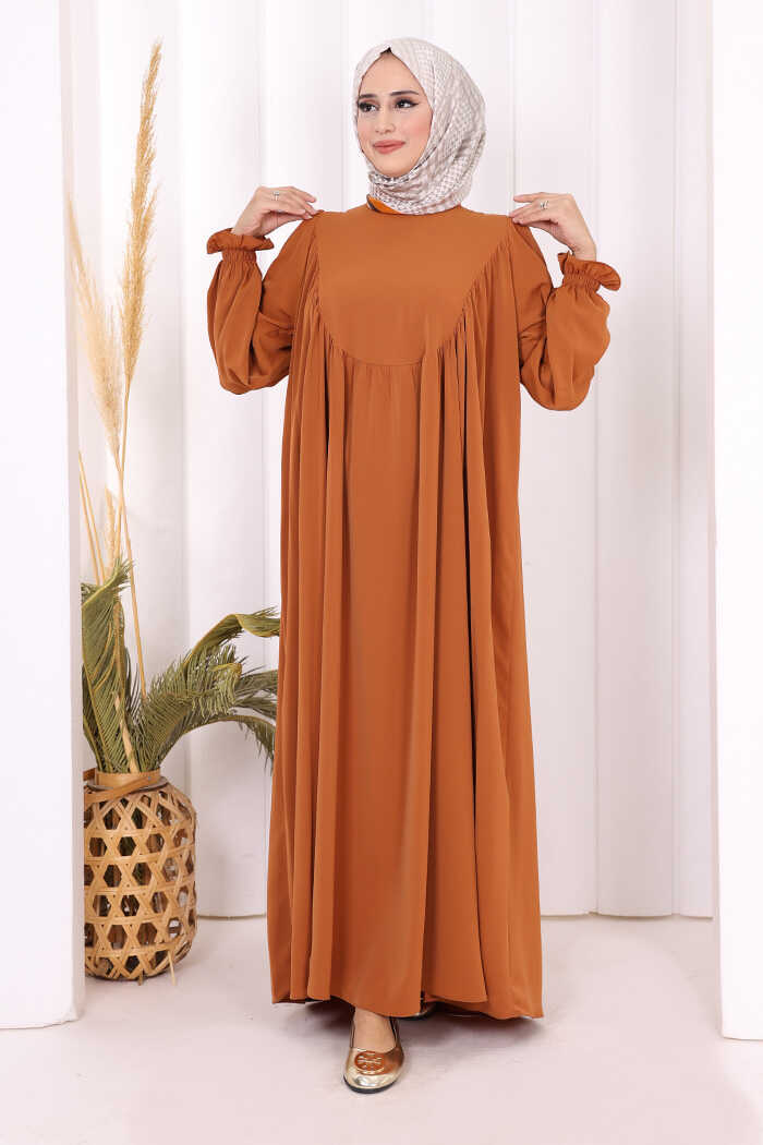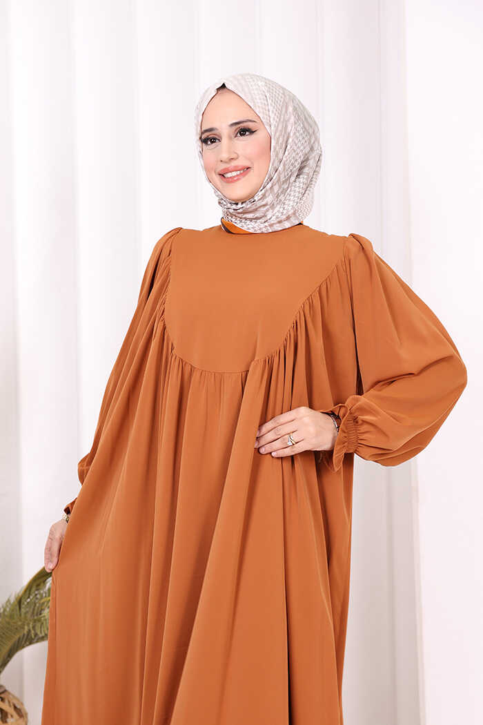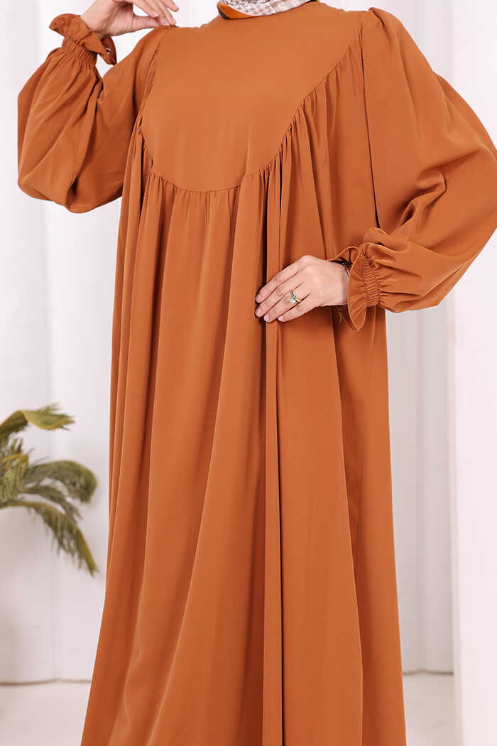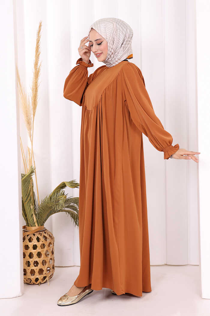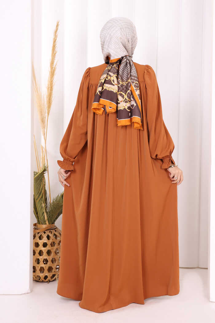 Kol Manşetleri Büzgülü Elbise 6004 Taba