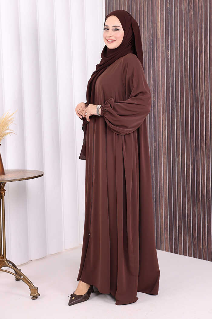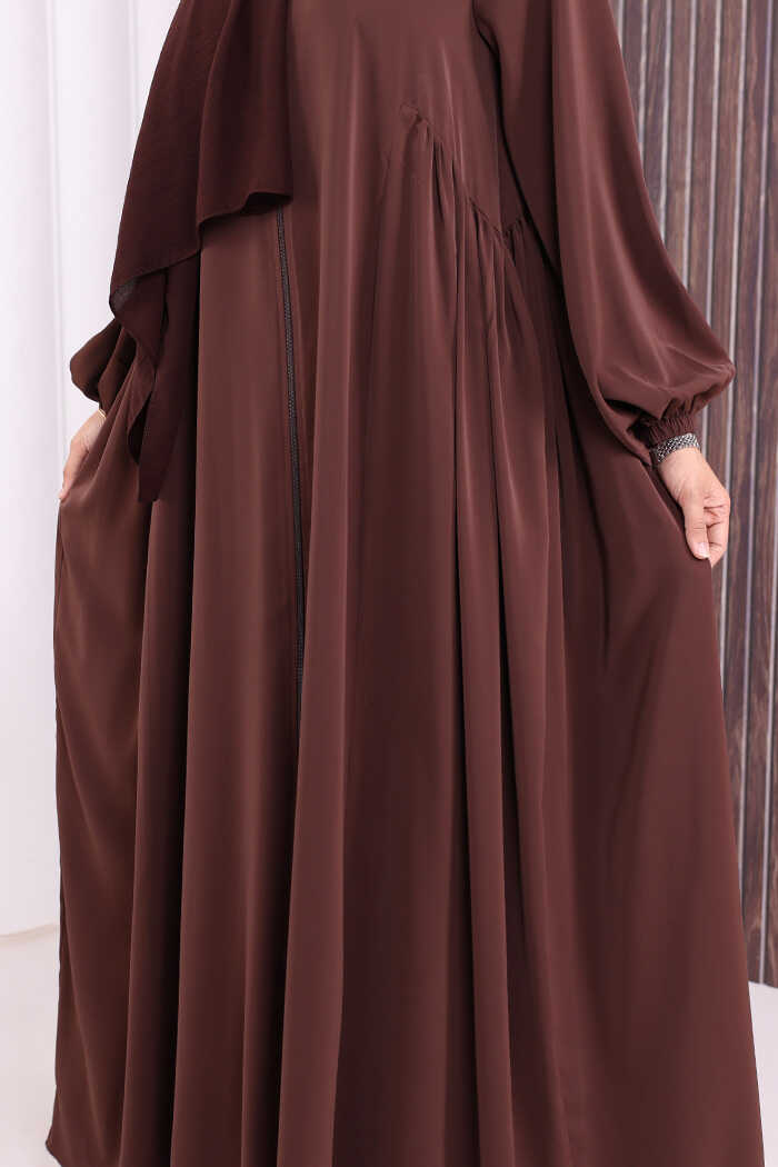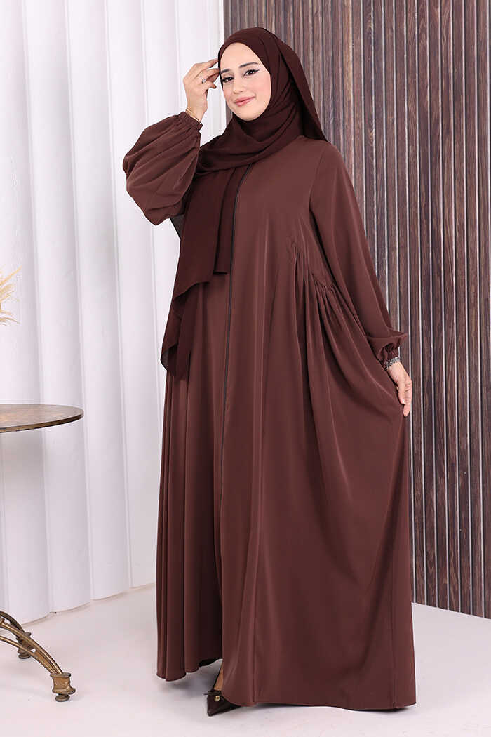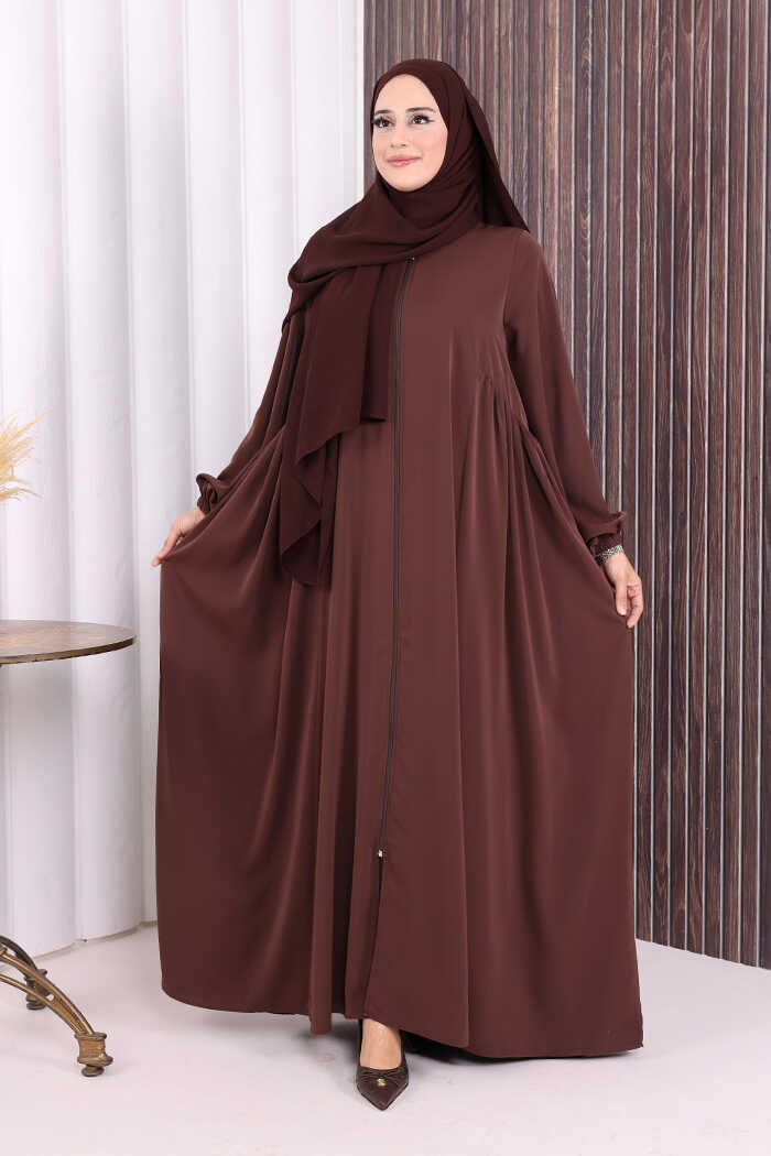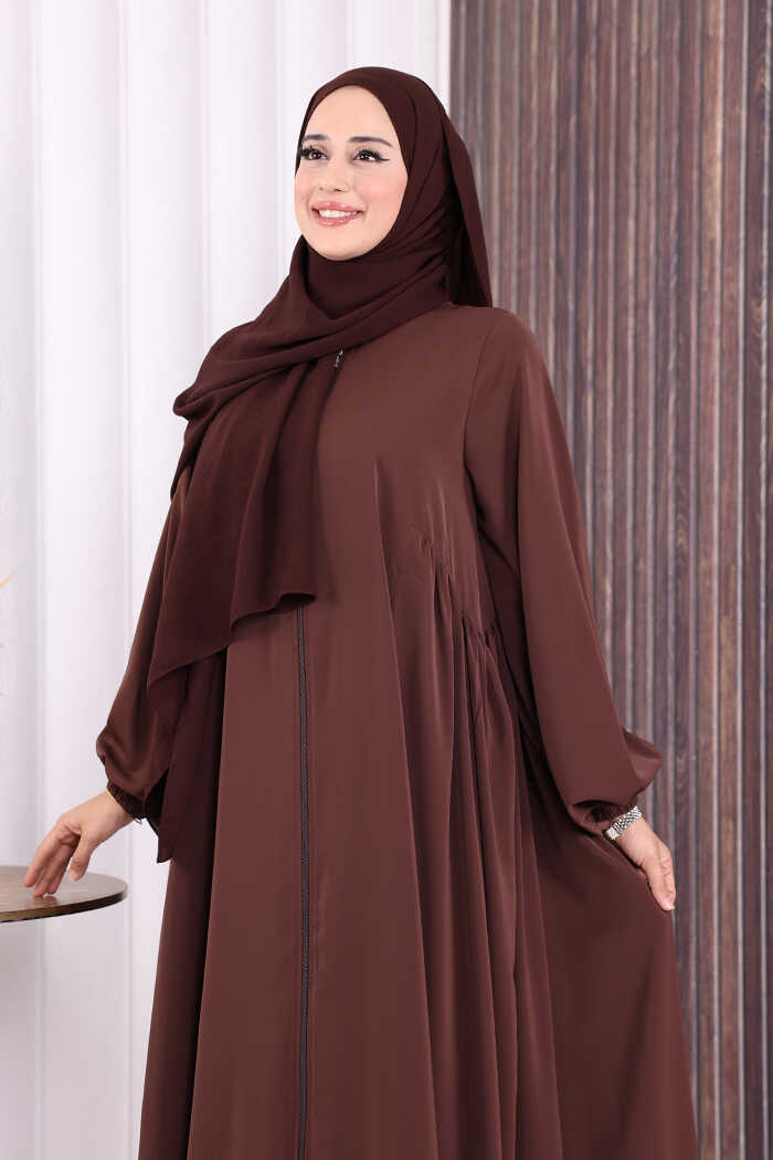 Oval Büzgülü Kol Manşetleri Lastikli Fermuarlı Tam Boy Ferace 6005 Kahverengi