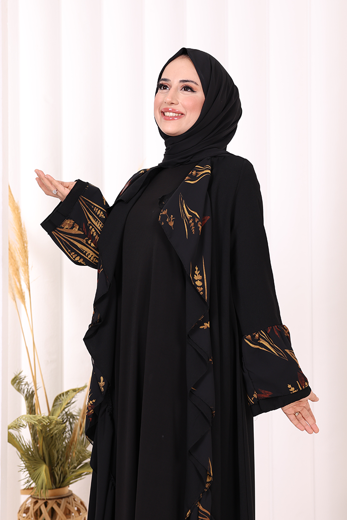 ÇİÇEK DESENLİ FIRFIRLI ABAYA: Kol manşetleri, ön kısmı ve etek uçlarında fırfır detayı mevcuttur. Fırfırları desenlidir. Düğme, kopçe, fermuar bulunmamaktadır. Tek abayadan oluşmaktadır. Şifon krep kumaştır. 38 40 42 44 46 48 beden aralığıdır. ÜRÜNÜN ÖLÇÜLERİ: 38 BEDEN: Kol 77cm Göğüs 100cm Pazu 30cm Boy 140cm 40 BEDEN: Kol 77cm Göğüs 104cm Pazu 32cm Boy 140cm 42 BEDEN: Kol 77cm Göğüs 108cm Pazu 34cm Boy 140cm 44 BEDEN: Kol 77cm Göğüs 112cm Pazu 36cm Boy 140cm 46 BEDEN: Kol 77cm Göğüs 116cm Pazu 38cm Boy 140cm 48 BEDEN: Kol 77cm Göğüs 120cm Pazu 40cm Boy 140cm