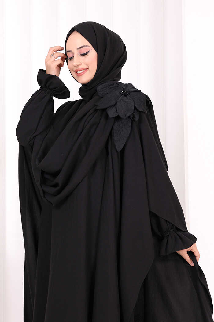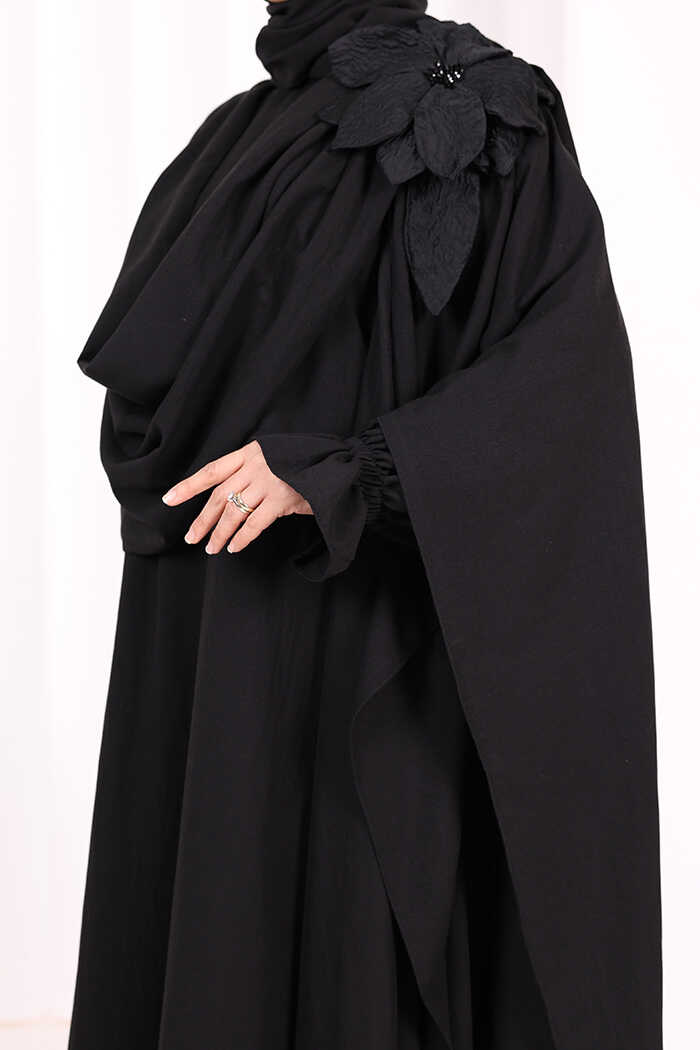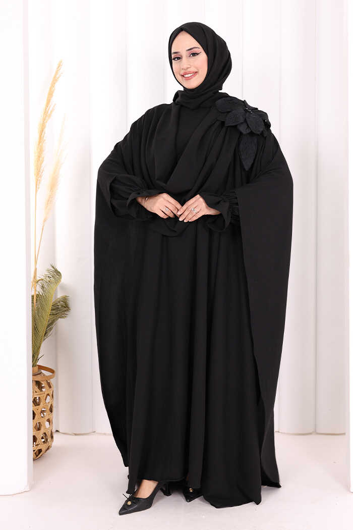 Çiçek Detaylı Elbise Abaya Takım 8009 Siyah
