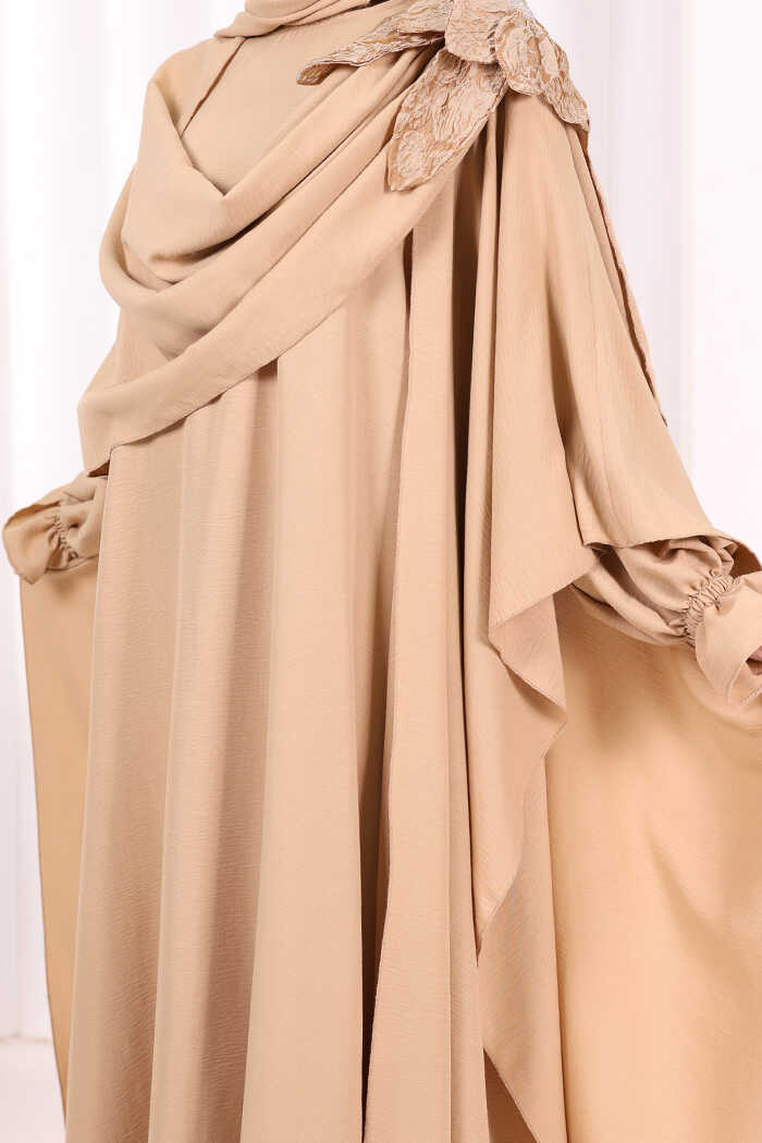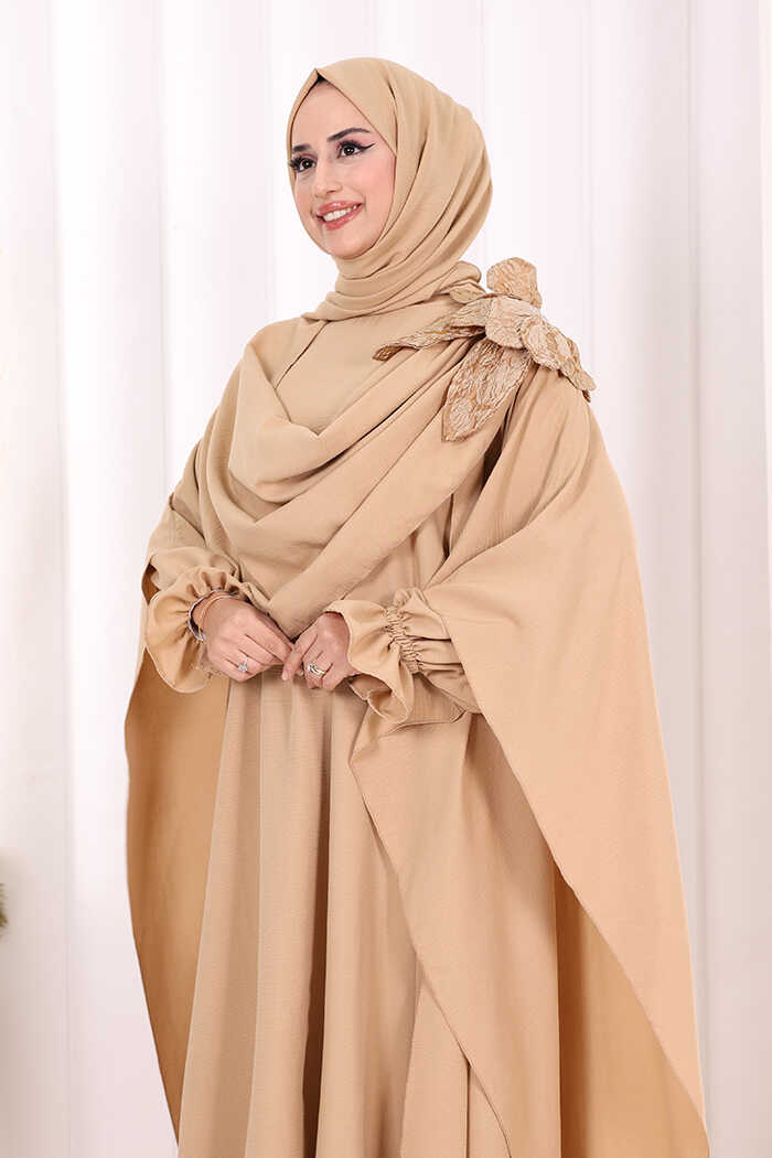 Çiçek Detaylı Elbise Abaya Takım 8009 Vizon