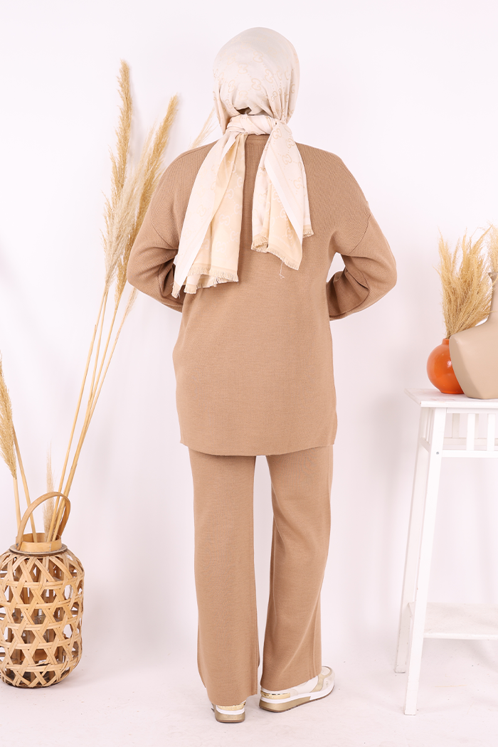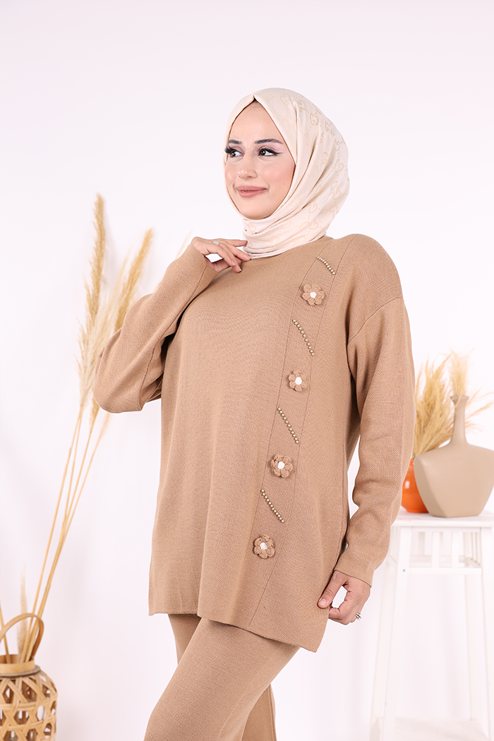 Çiçek Detaylı Triko Takım 1620 Vizon