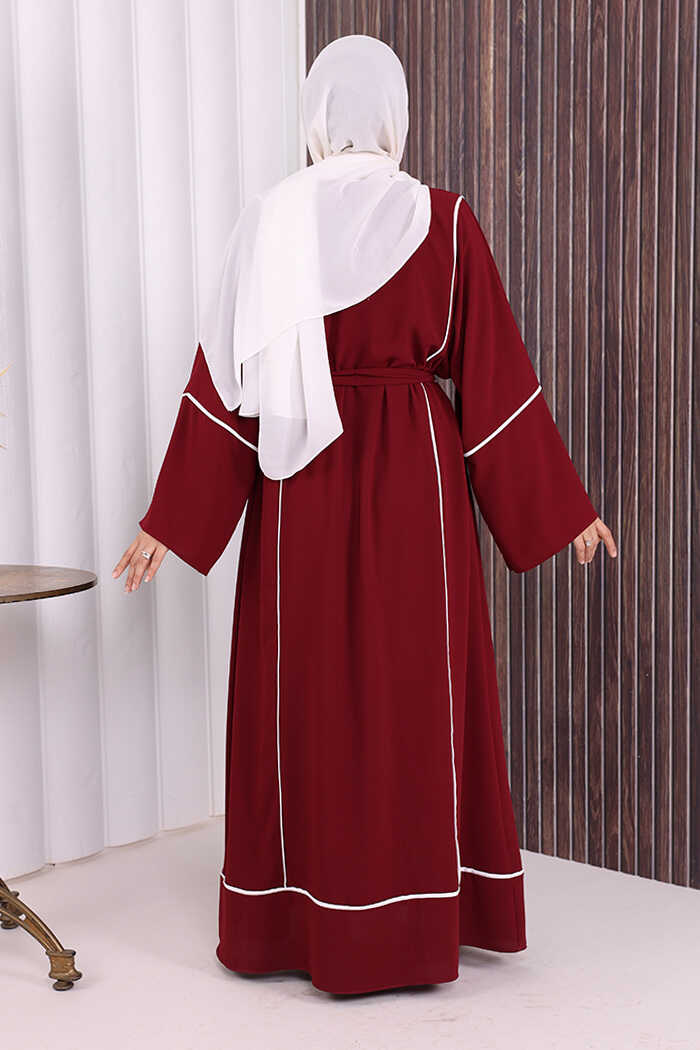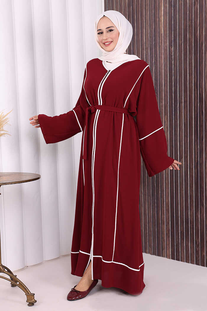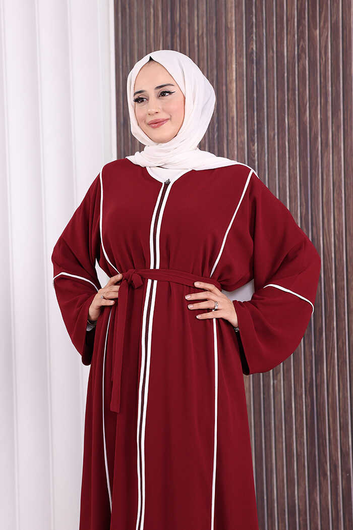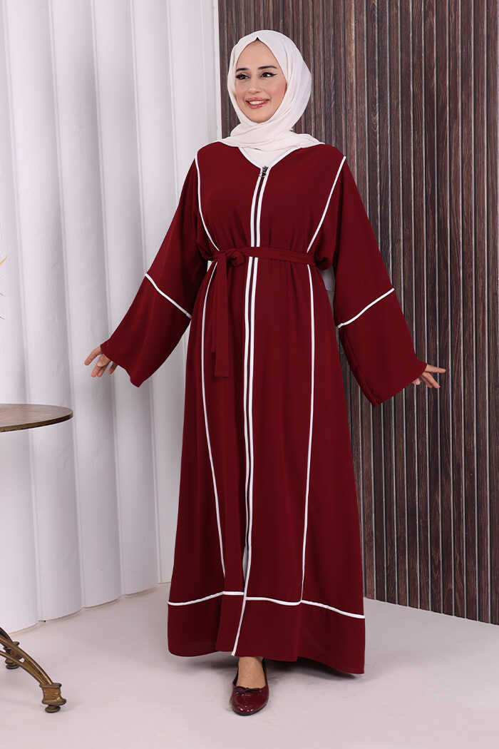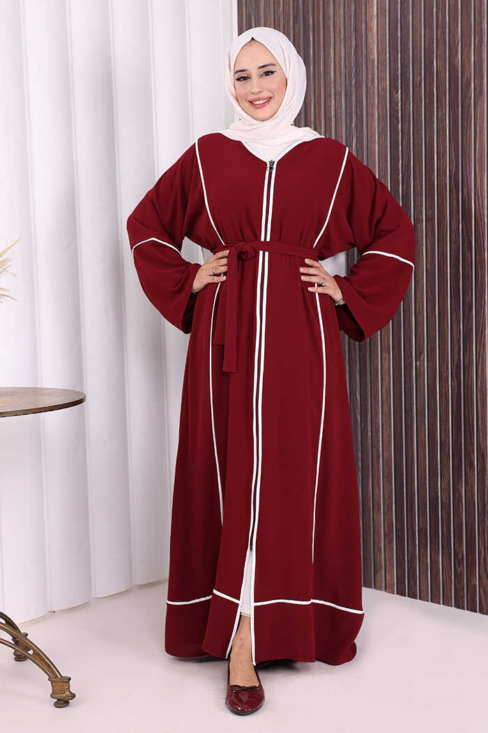 Çizgi Desenli Önü Boydan Fermuarlı Bel Kuşaklı Ferace 7885 Bordo