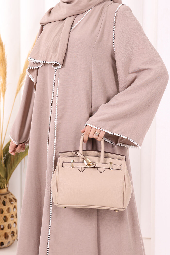 Dantel Şeritli Abaya Elbise Şal Üçlü Takım 6074 Vizon