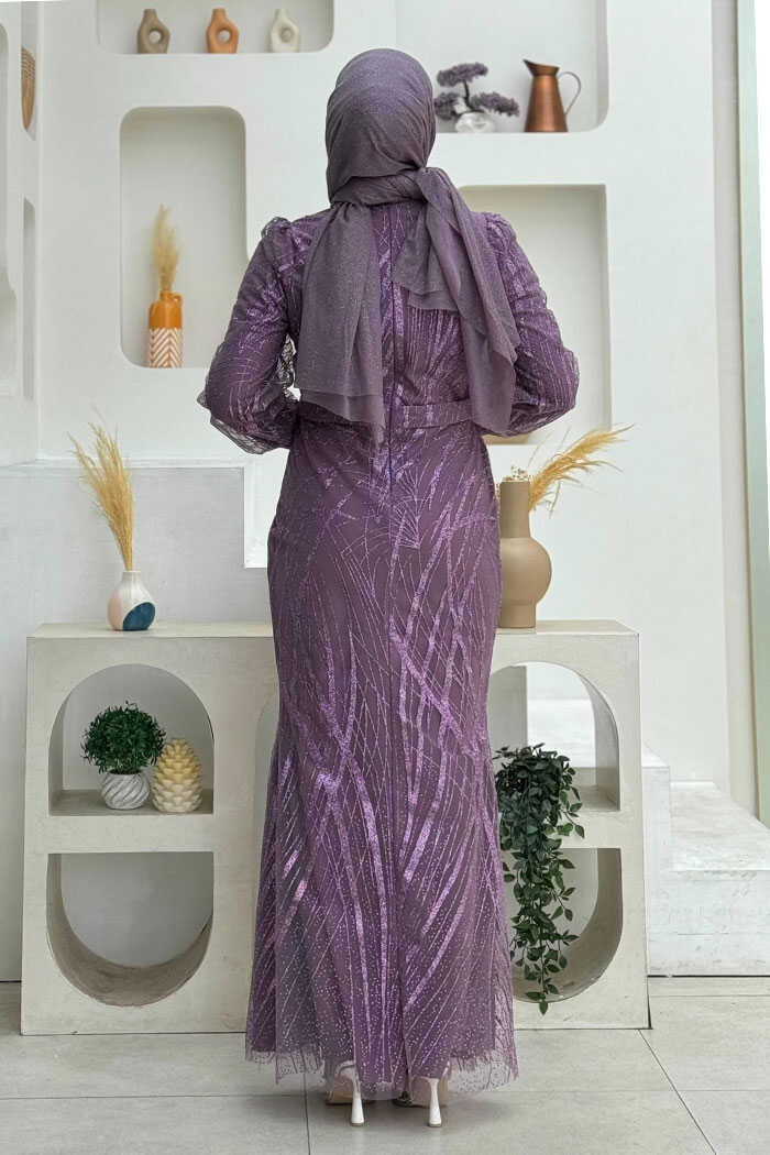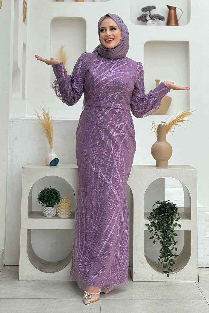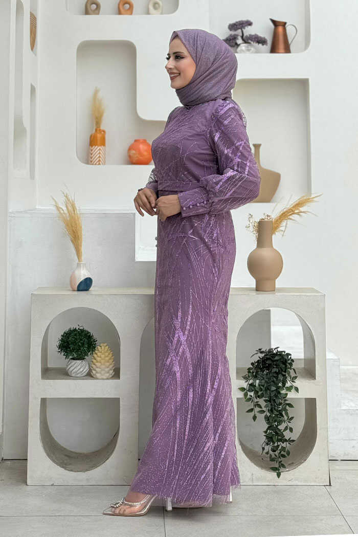 Desenli Bel Kemerli Balık Abiye Elbise 1139 Lila