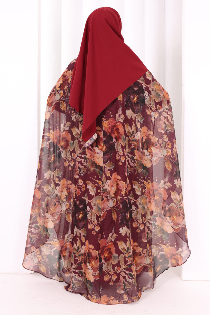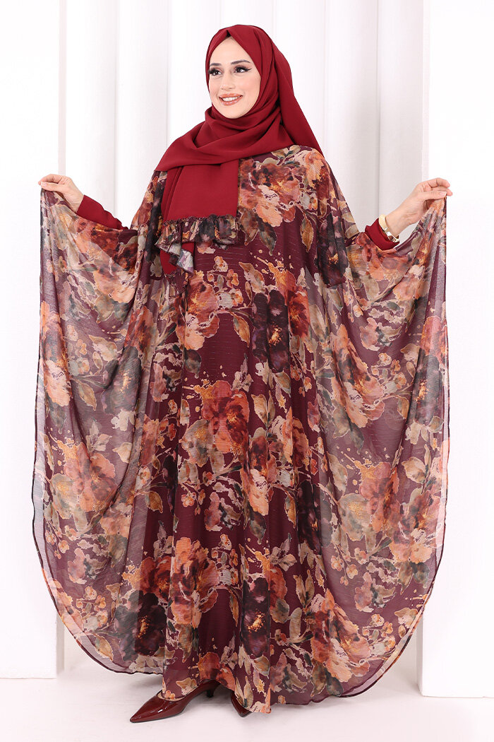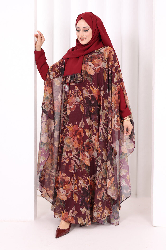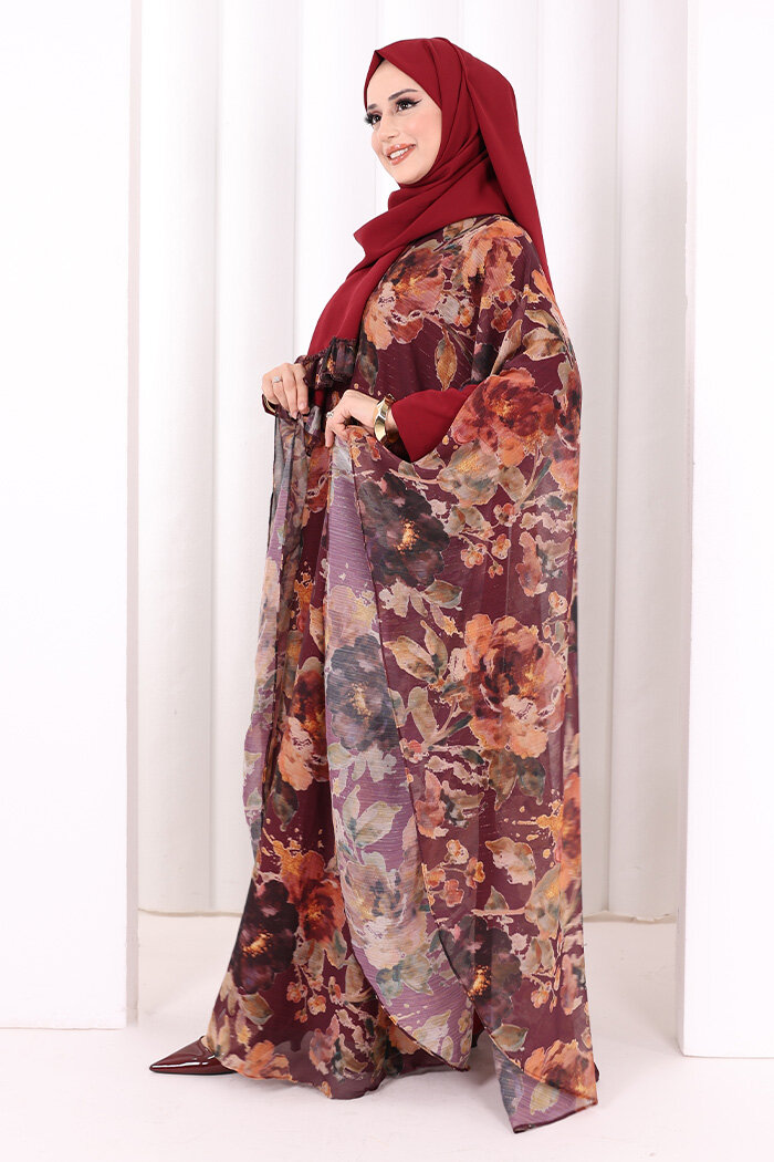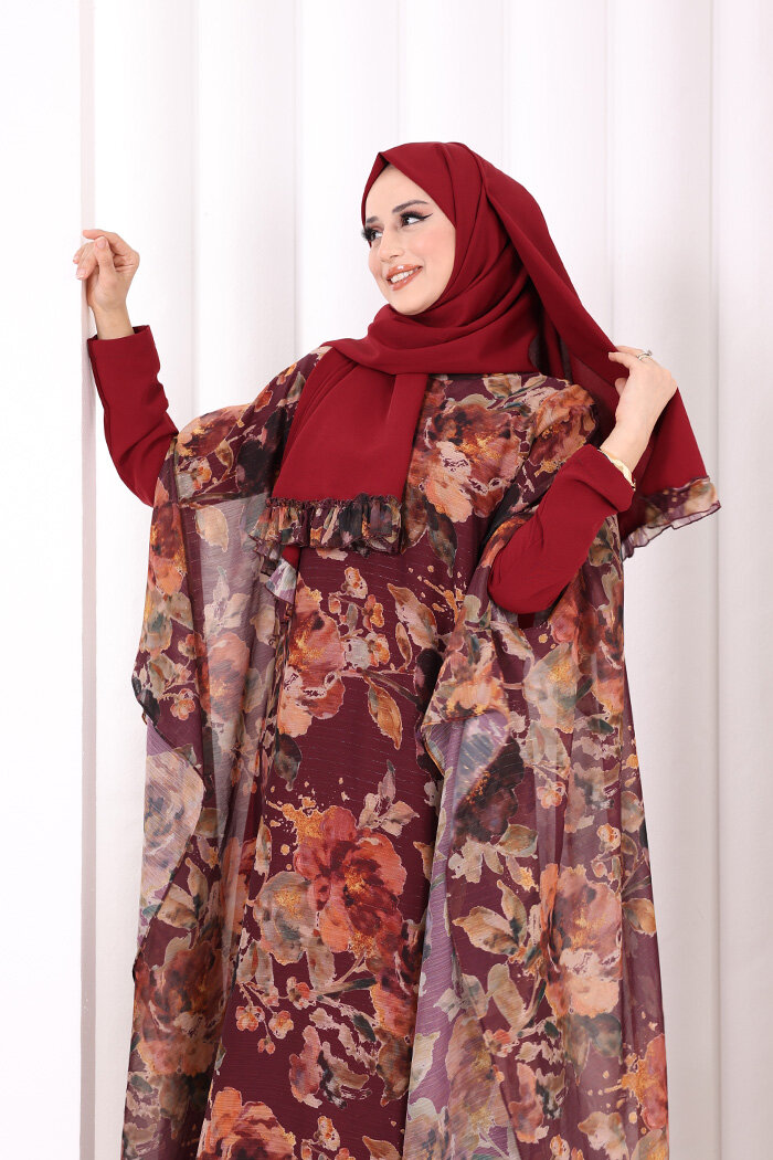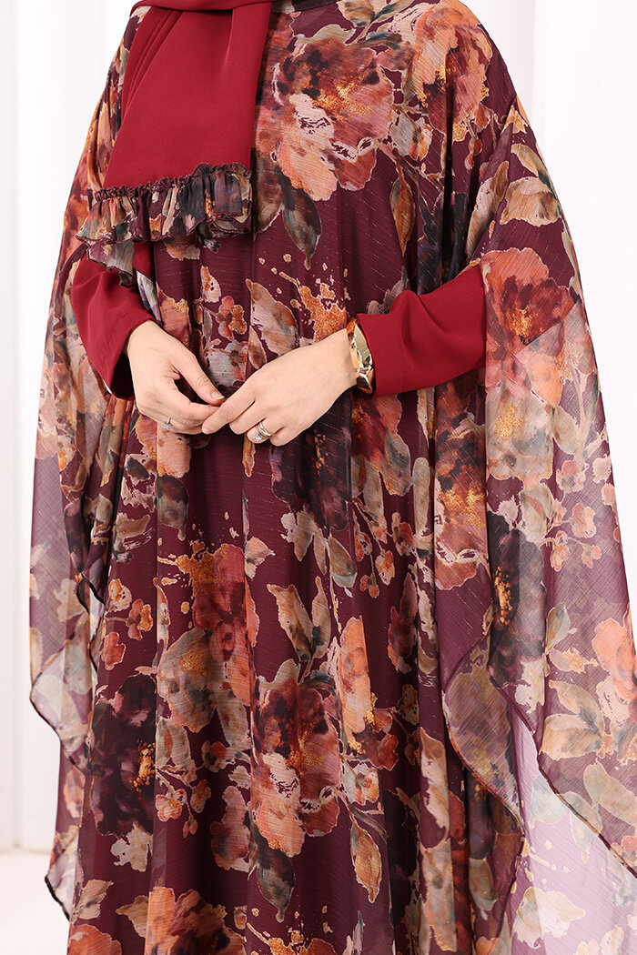 Desenli Şallı Elbise 6076 Mürdüm