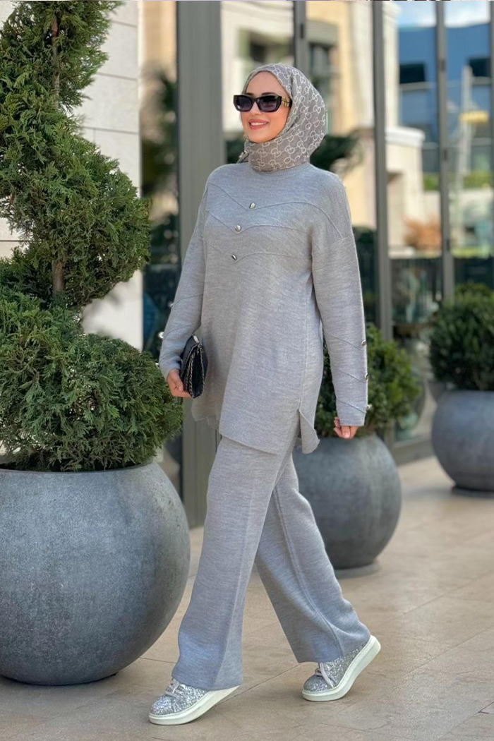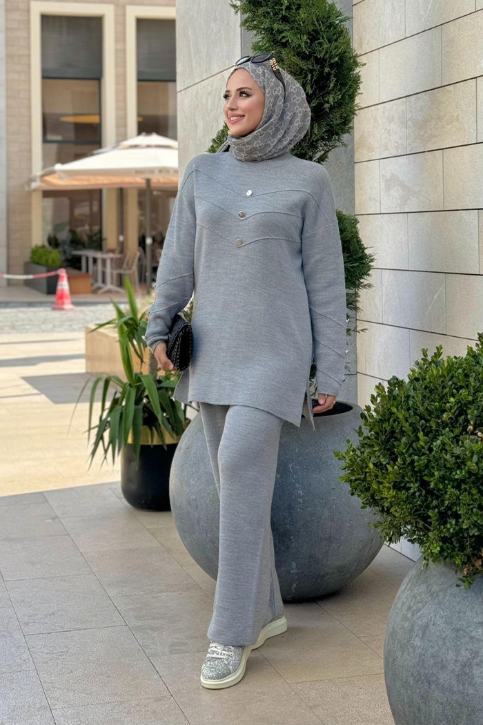 Düğme Detaylı Tunik Ve Pantolon İkili Triko Takım 2-1530 Gri