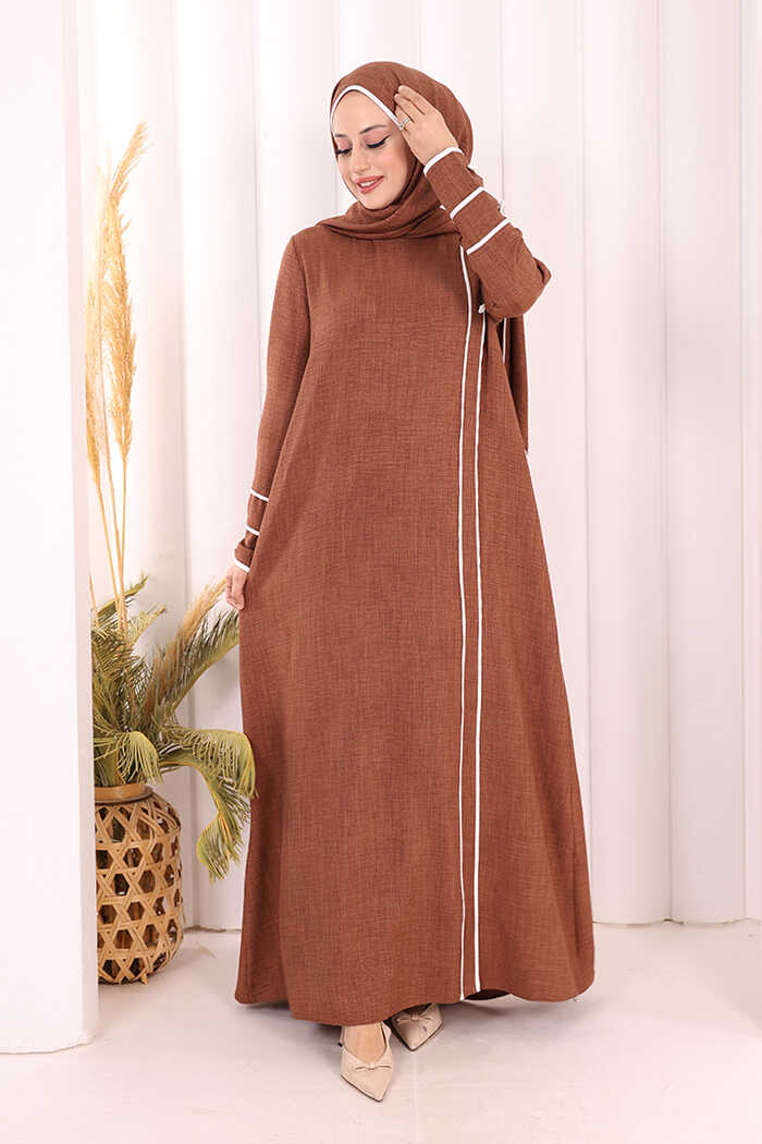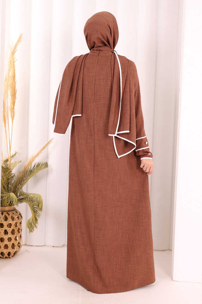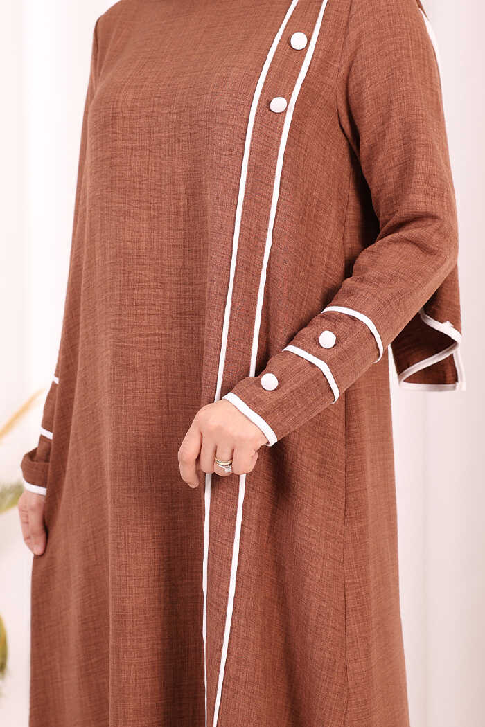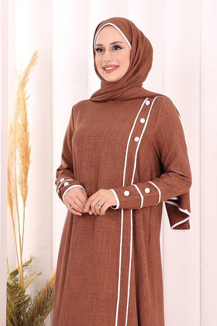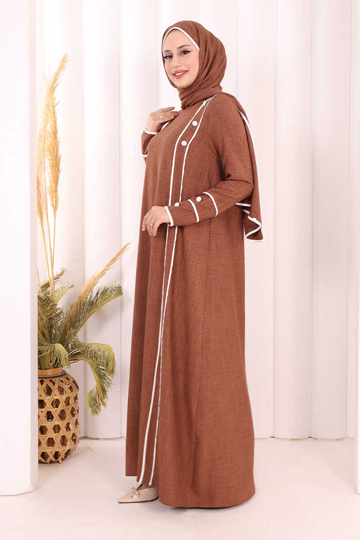 Düğme ve Şerit Detay Elbise Şal Hediye! 6060 Taba