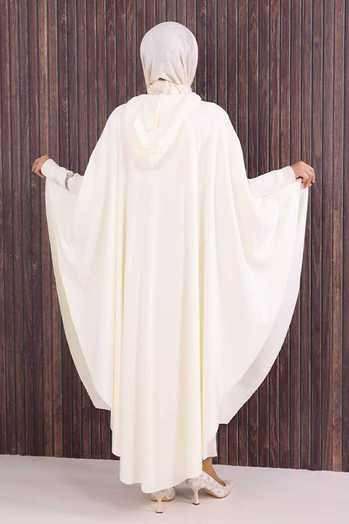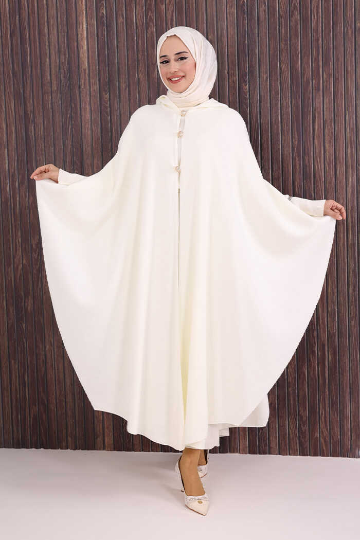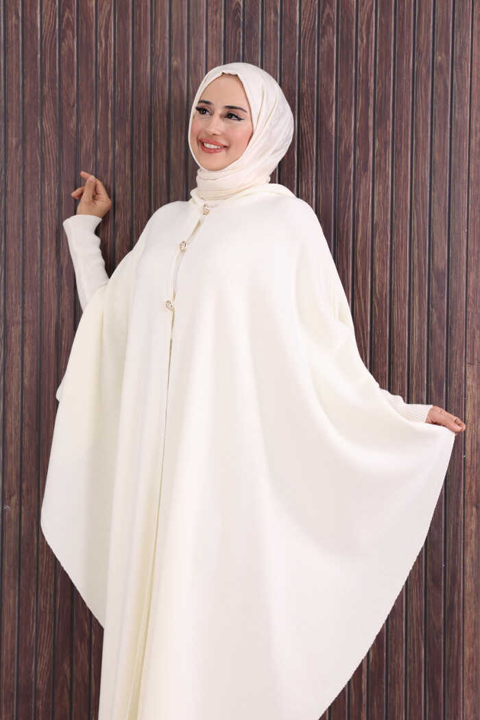 Düğmeli Kapşonlu Triko Panço 18342 Ekru