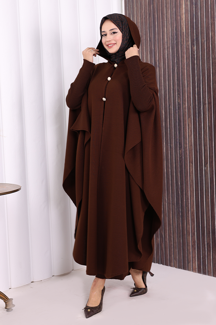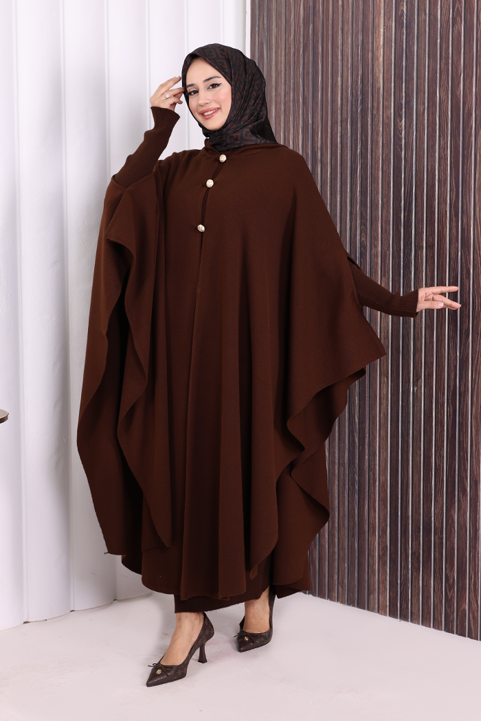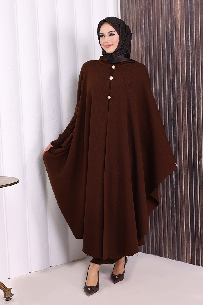Düğmeli Kapşonlu Triko Panço 18342 Kahverengi
