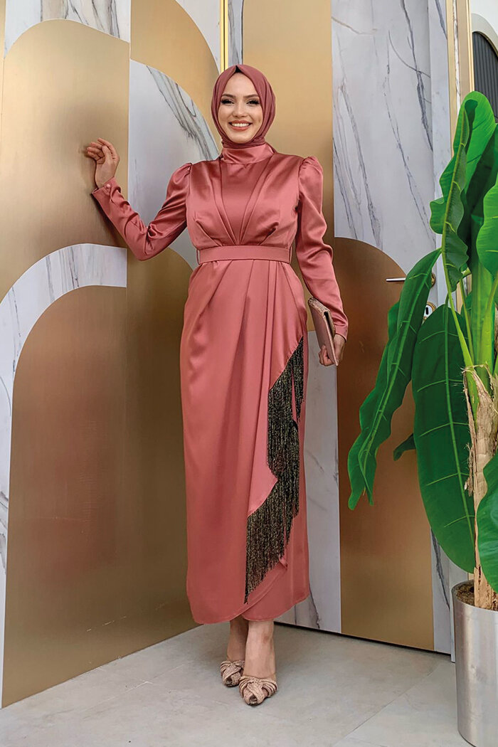 Etek Püskül Detay Kemer Aksesuarlı Saten Abiye Elbise 3763 gülkurusu siyah
