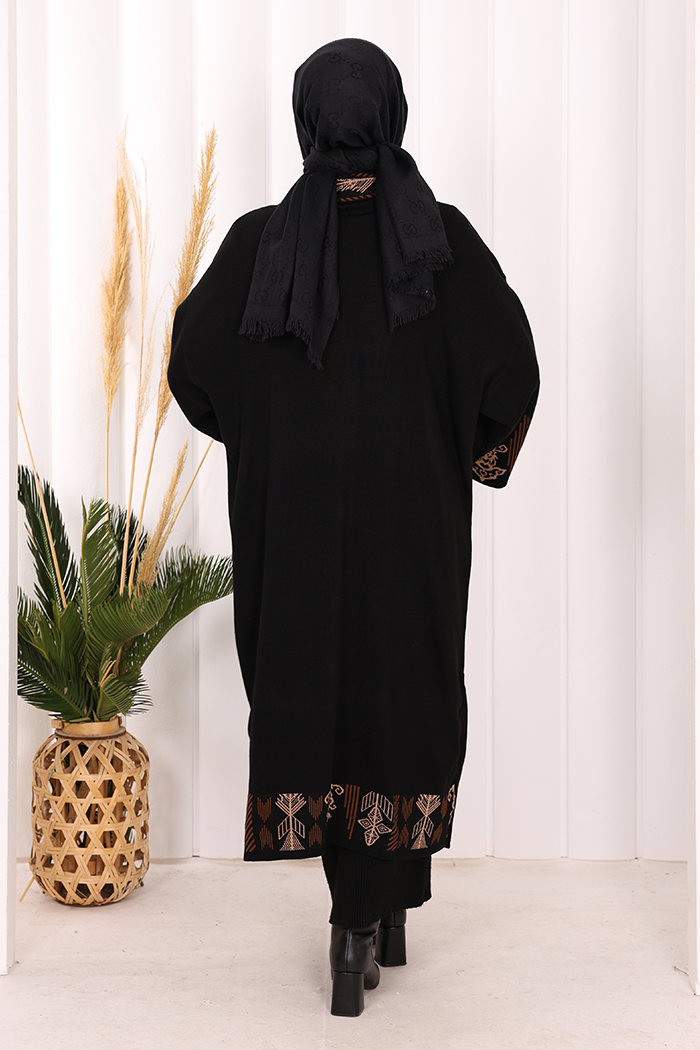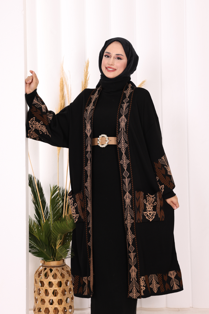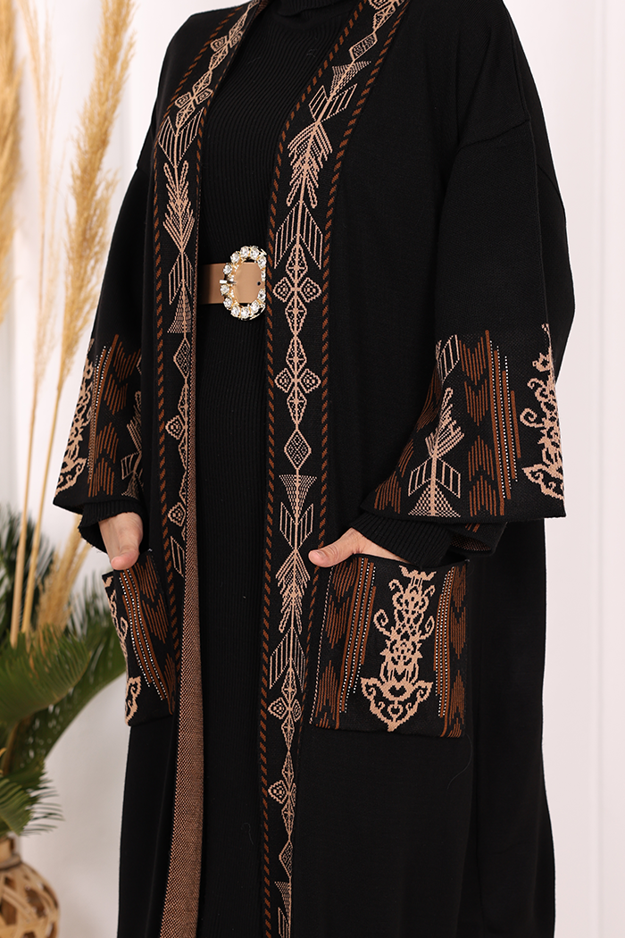 Etnik Desenli Cepli Triko Hırka 12003 Siyah