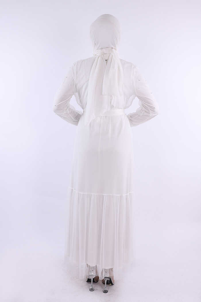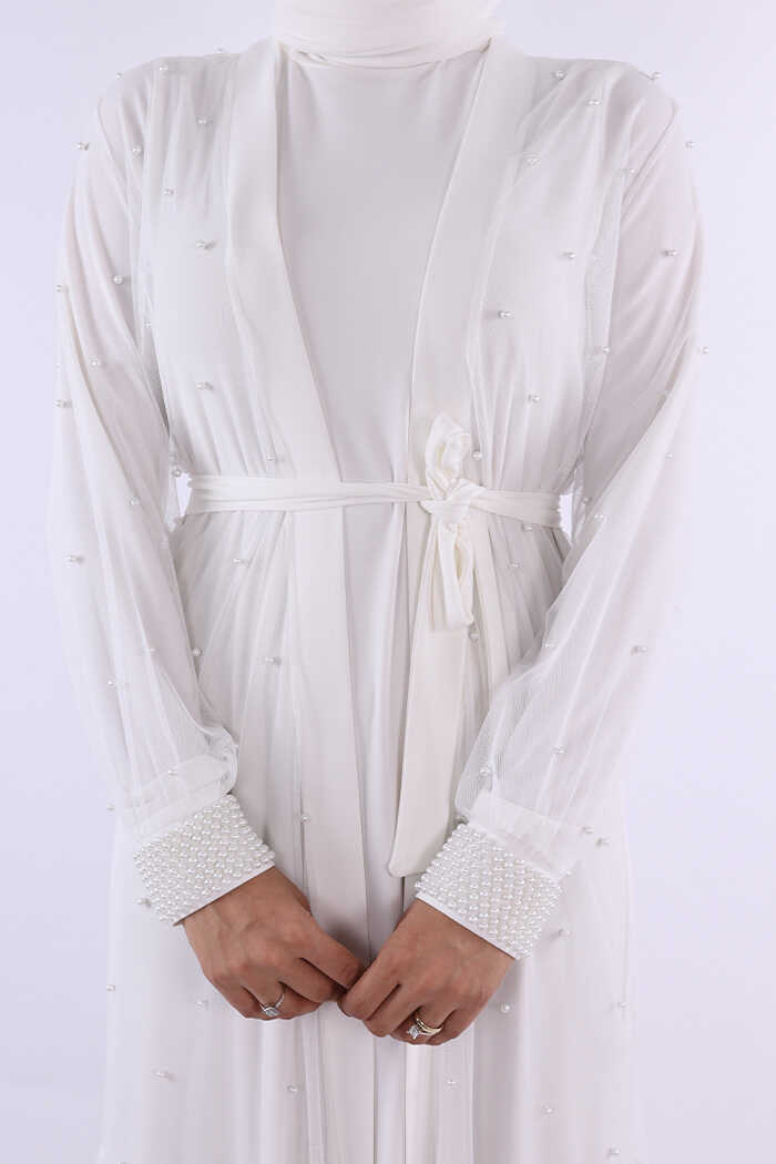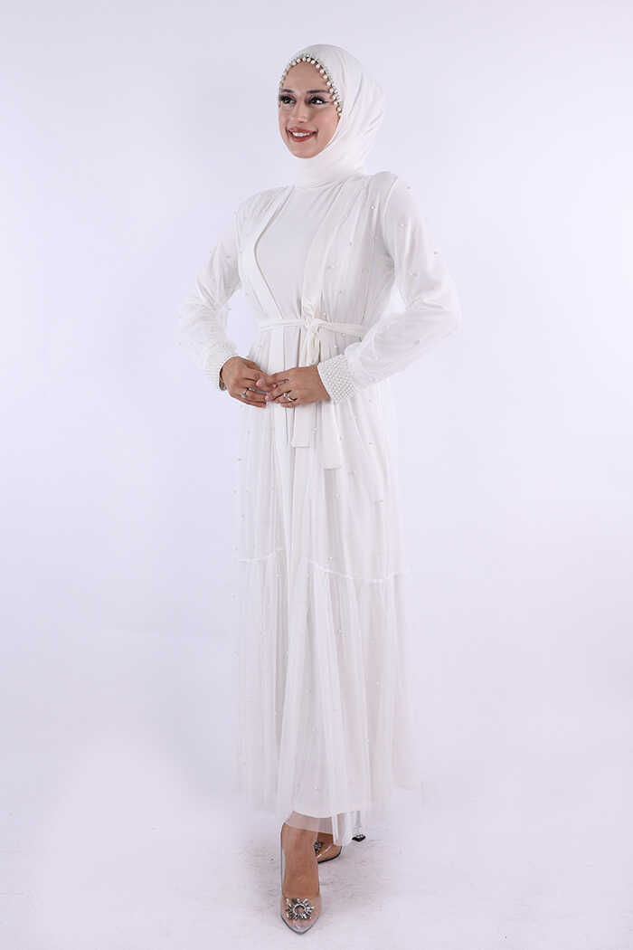 İncili Abaya Ve Elbise Takım 8491 Ekru
