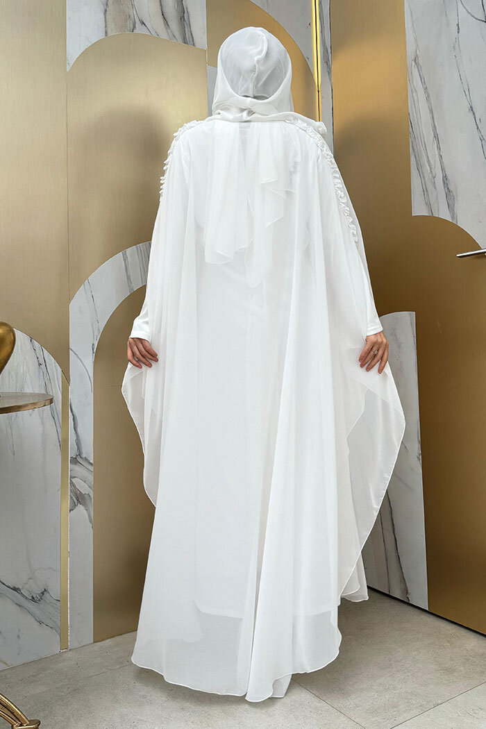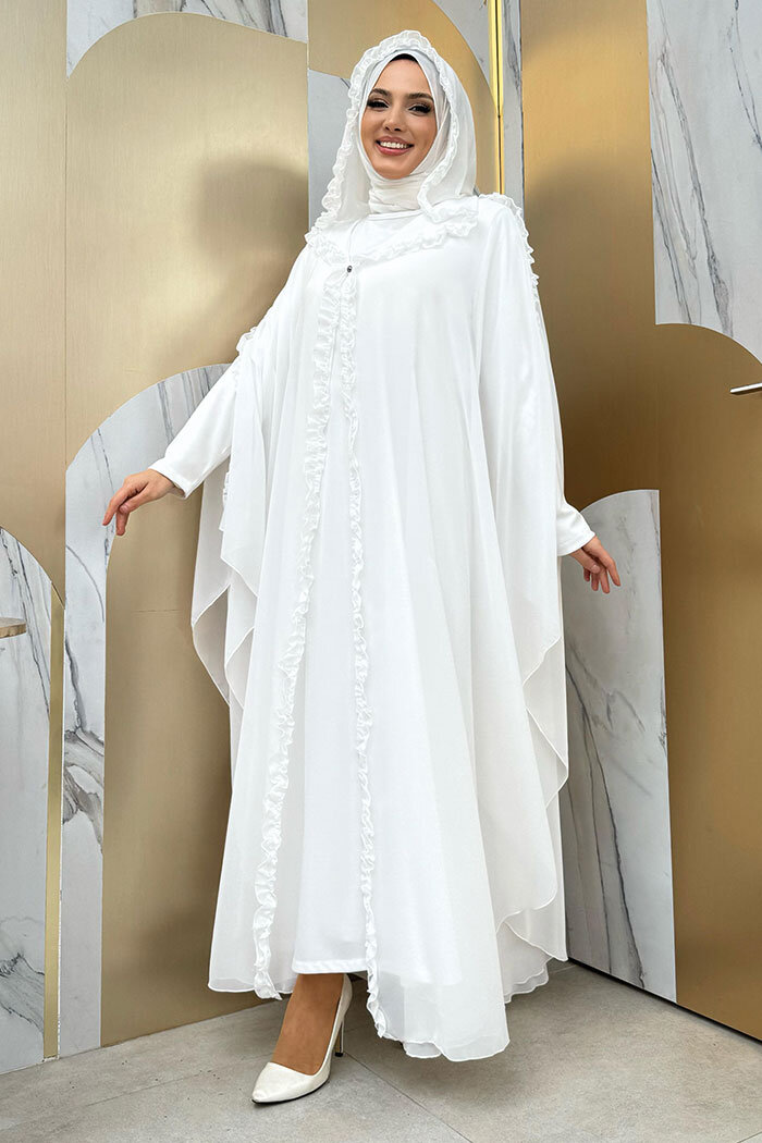 Kapişonlu Abayalı Elbise Takım 3778 Ekru