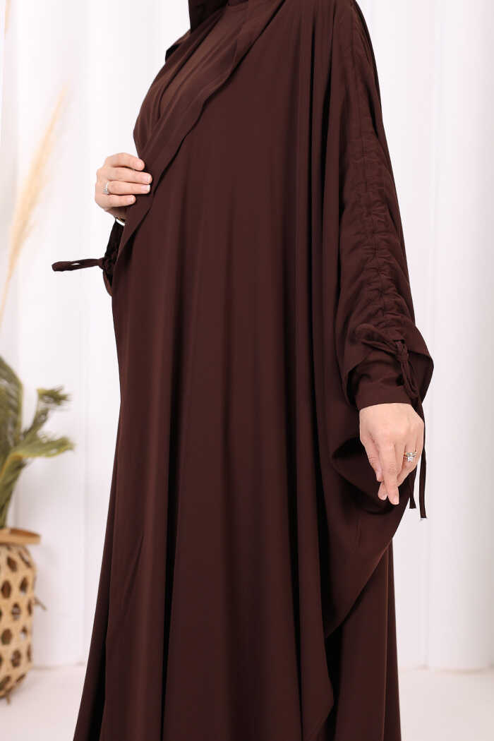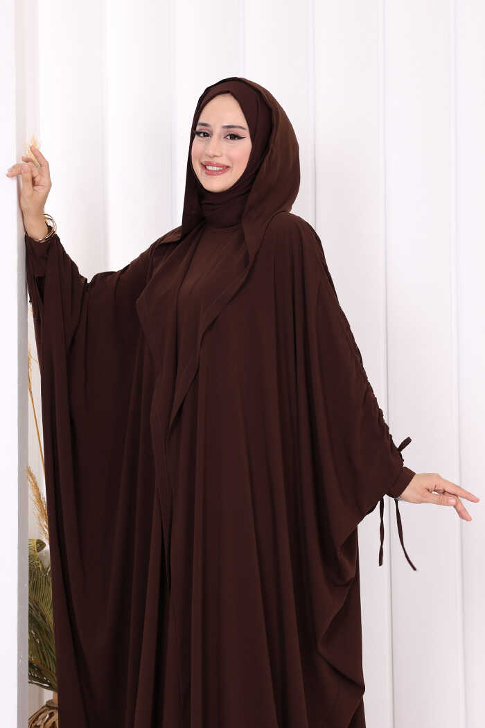 Kapüşonlu Abaya ve Elbise İkili Takım 70013 Kahverengi