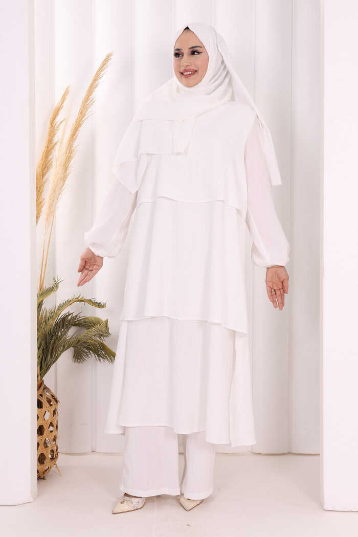 Kat Detaylı Tunik Pantolon Takım ŞAL HEDİYE! 8017 Ekru