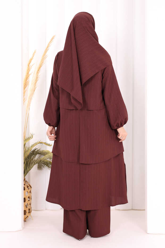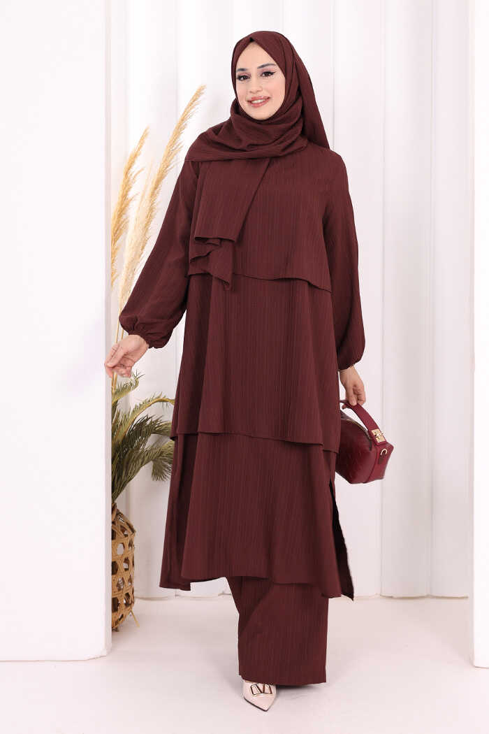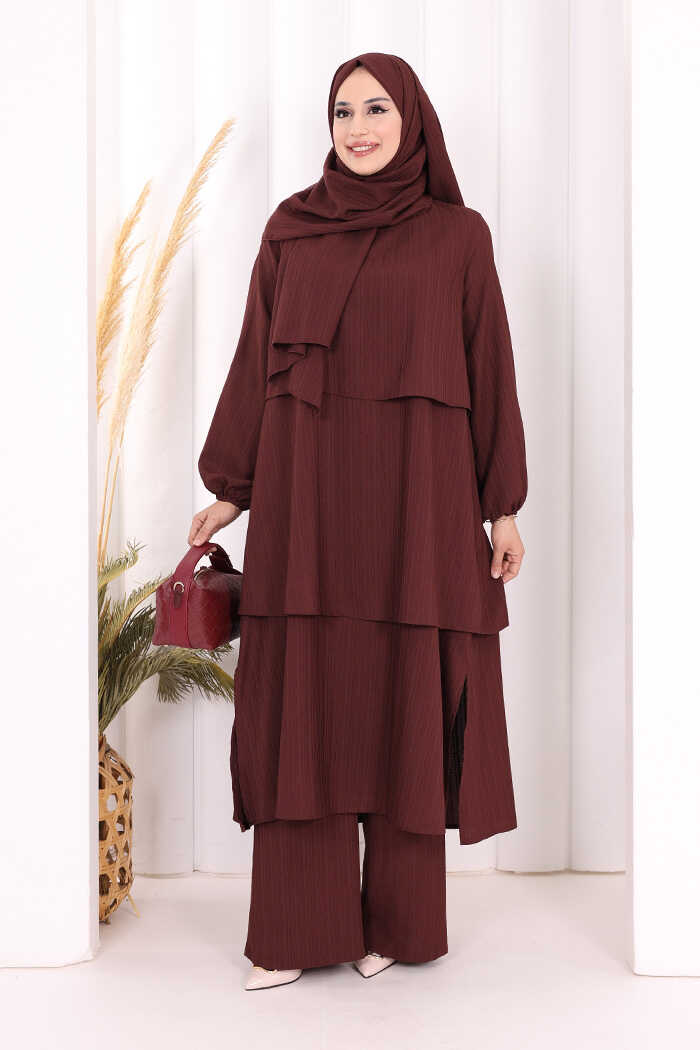 Kat Detaylı Tunik Pantolon Takım ŞAL HEDİYE! 8017 Mürdüm