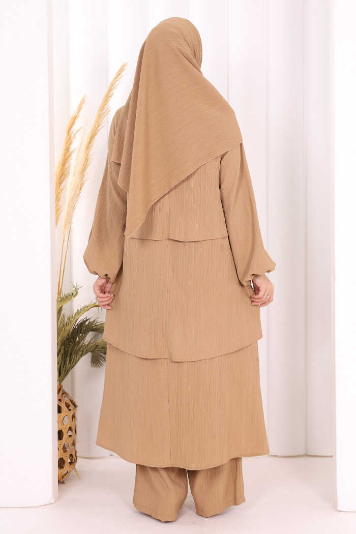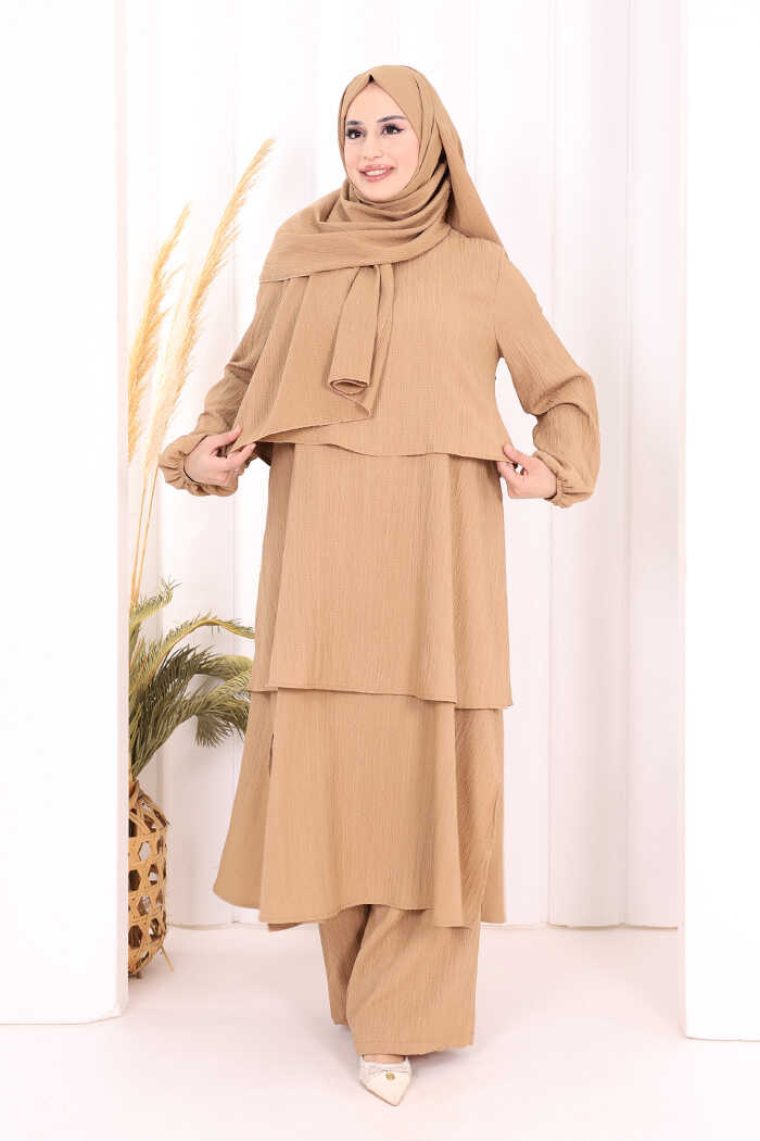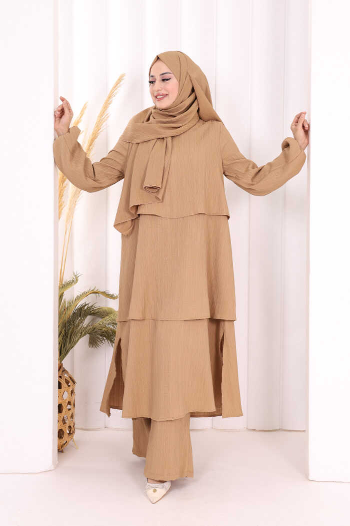 Kat Detaylı Tunik Pantolon Takım ŞAL HEDİYE! 8017 Taba
