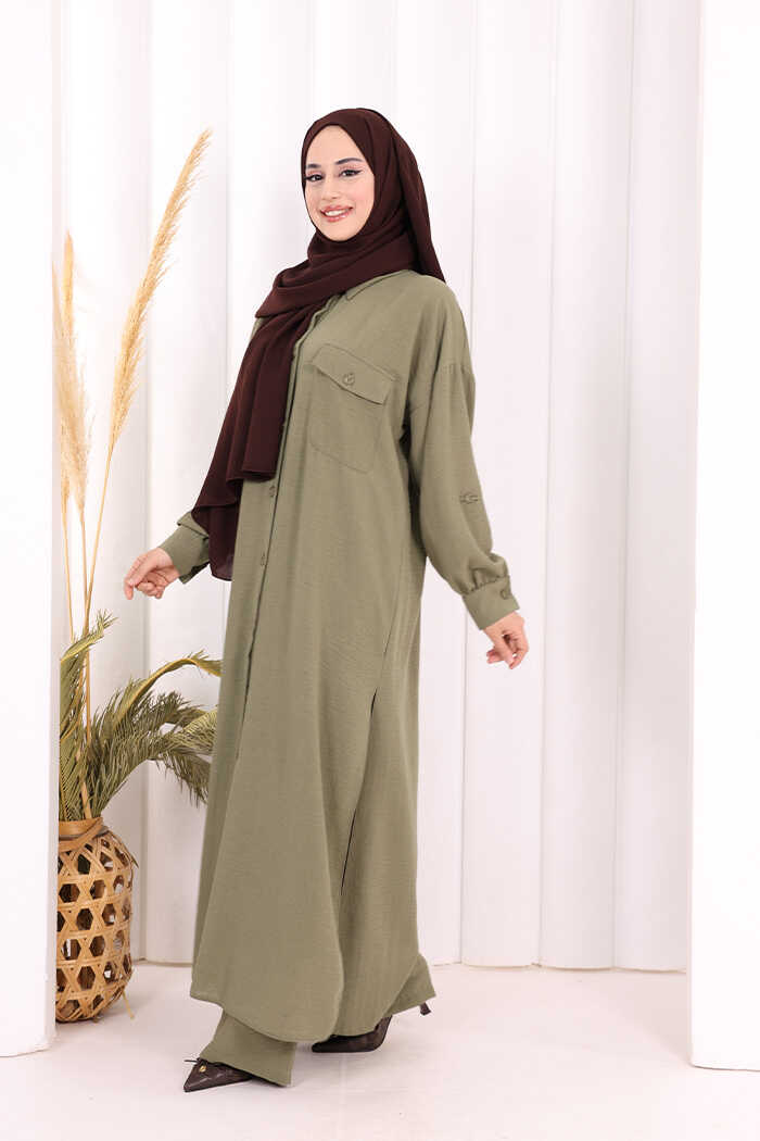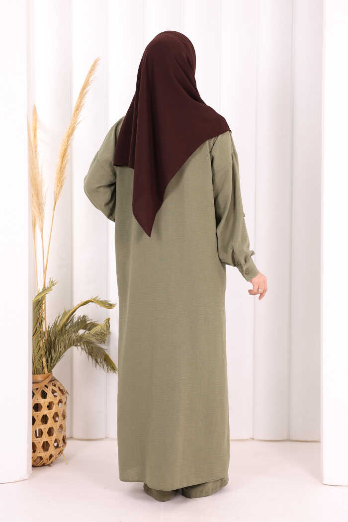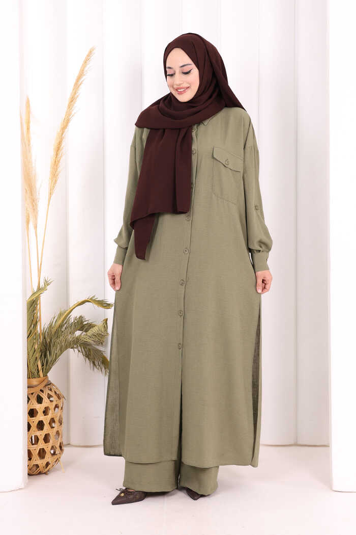 Keten Düğmeli Tunik Pantolon Takım 8015 Haki