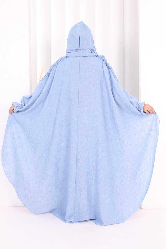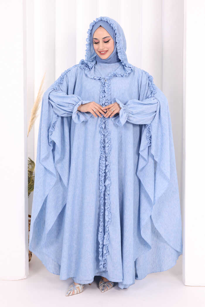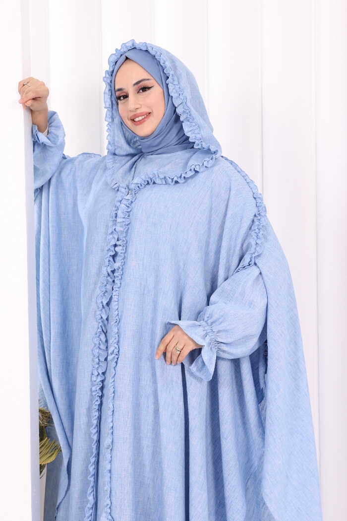 Keten Pelerinli Elbise Abaya Takım 8021 Mavi