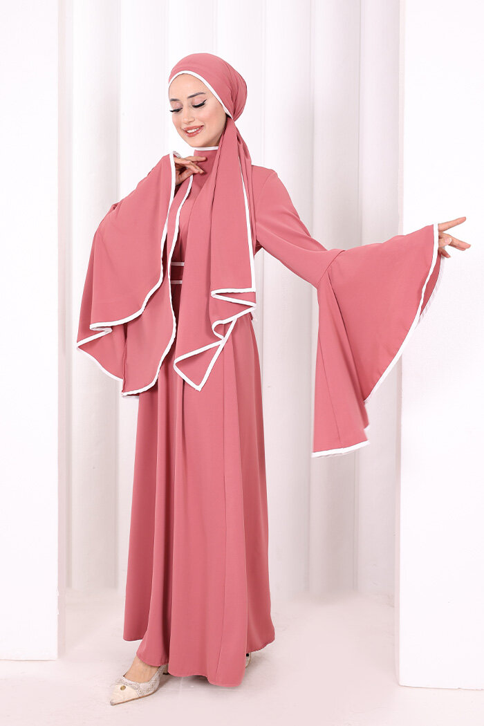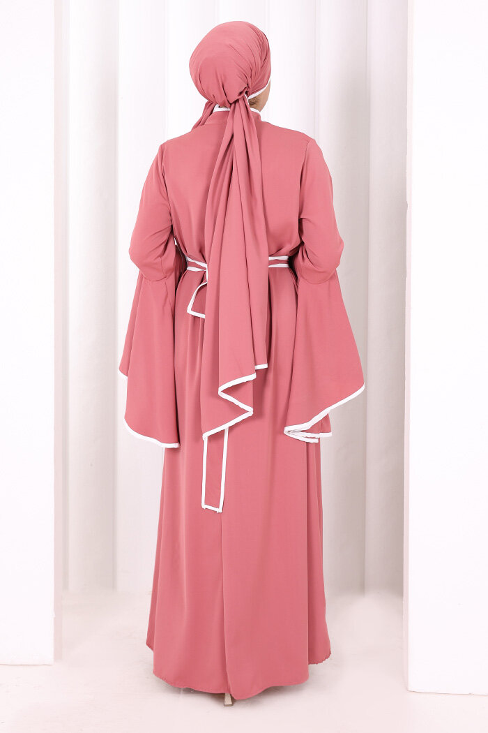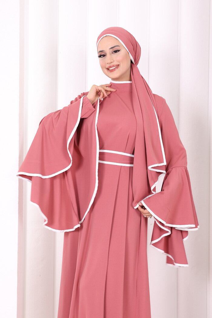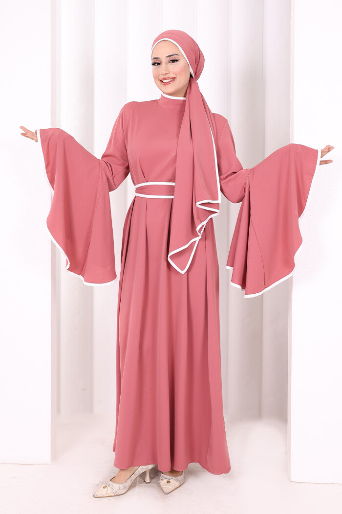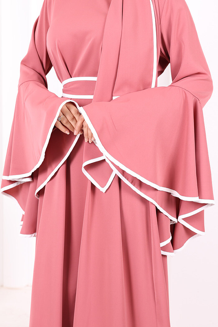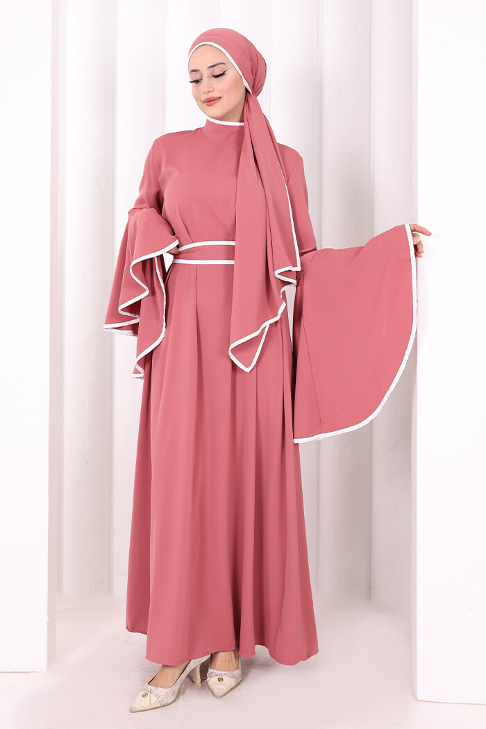 Kol Fırfır Şerit Detaylı Şallı Elbise 6084 Gül Kurusu