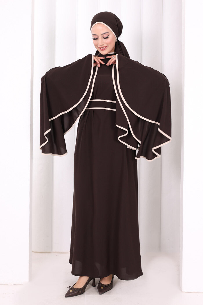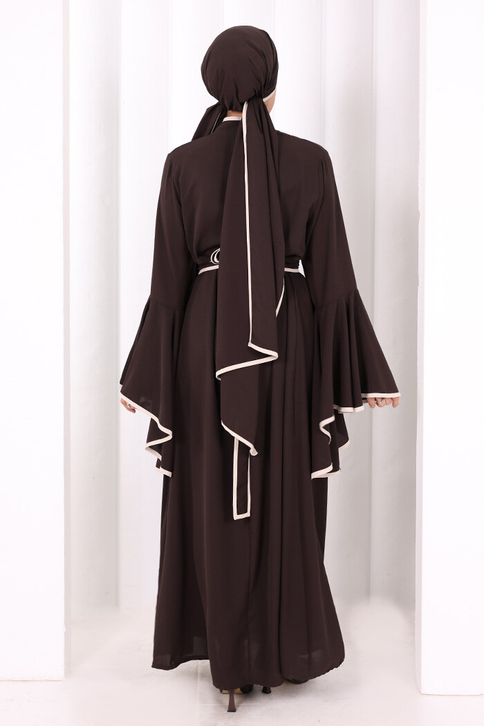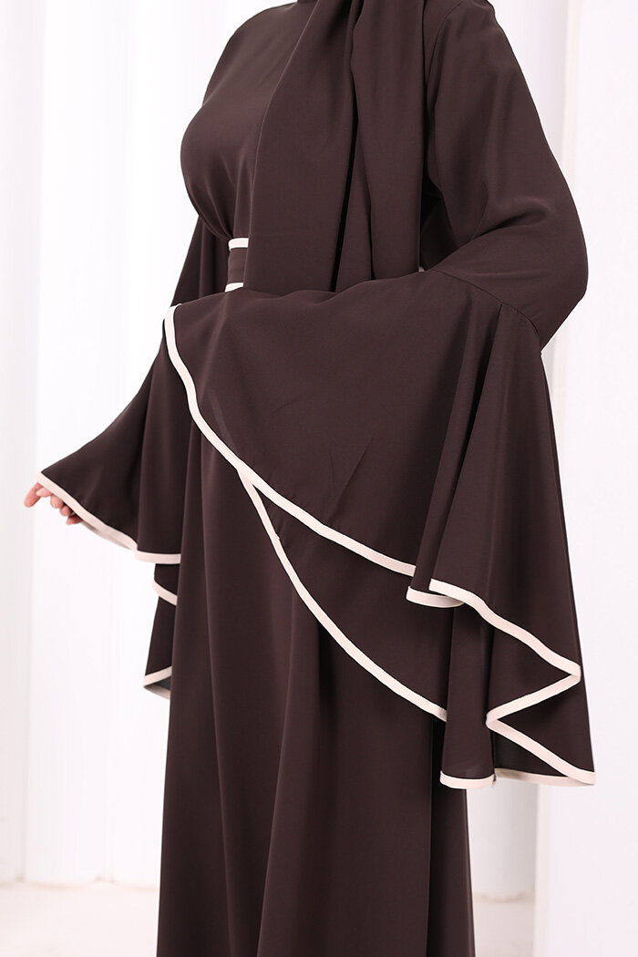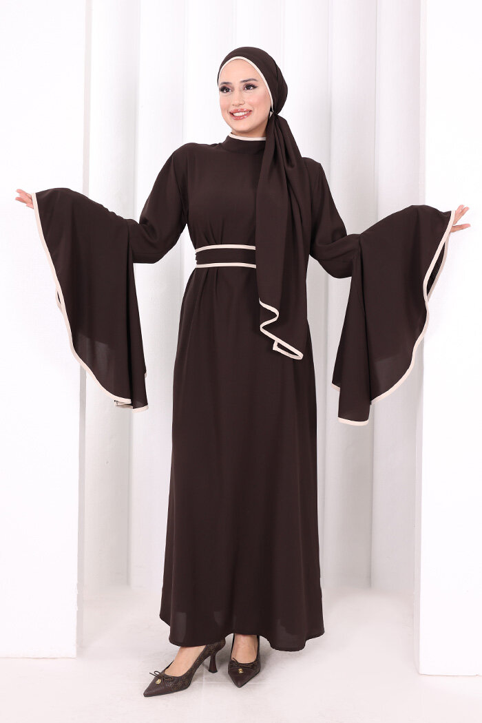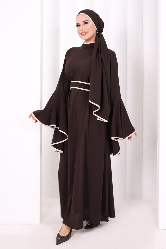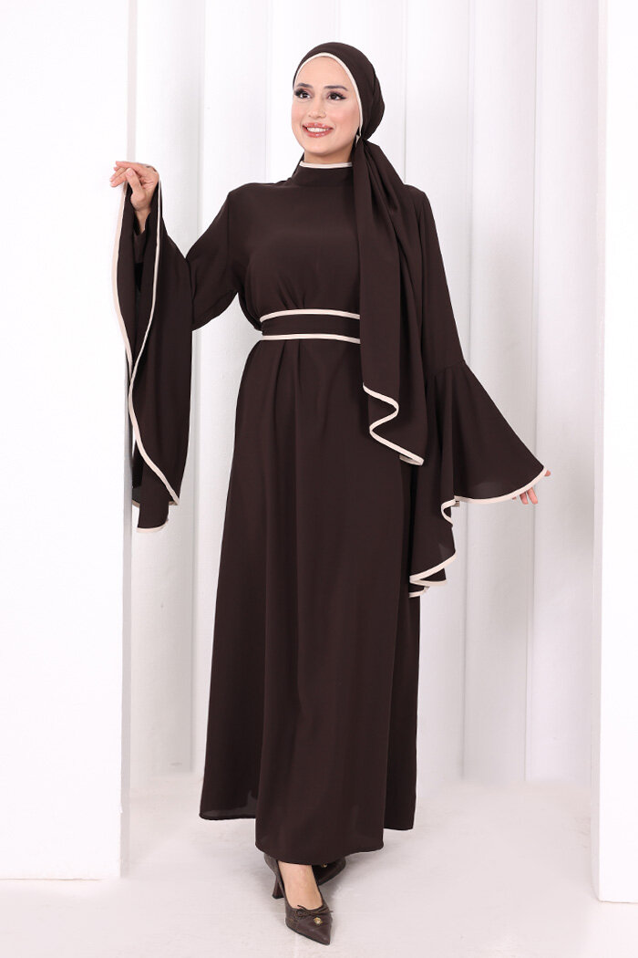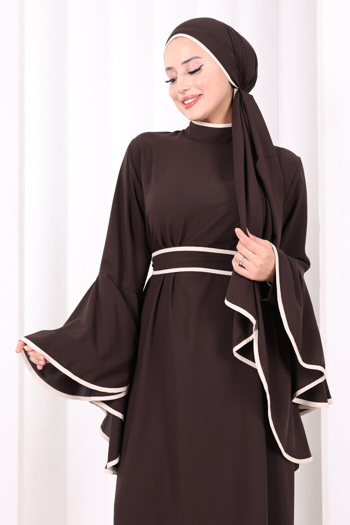 Kol Fırfır Şerit Detaylı Şallı Elbise 6084 Kahverengi