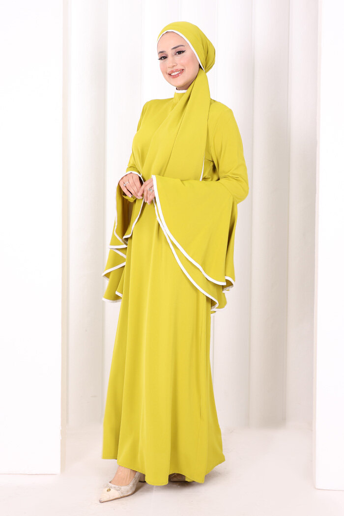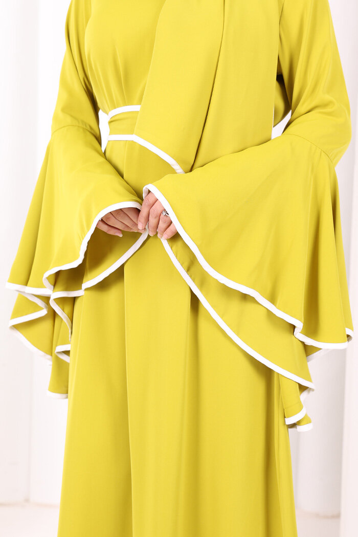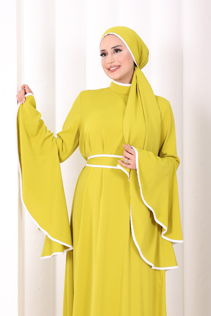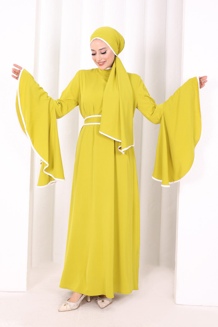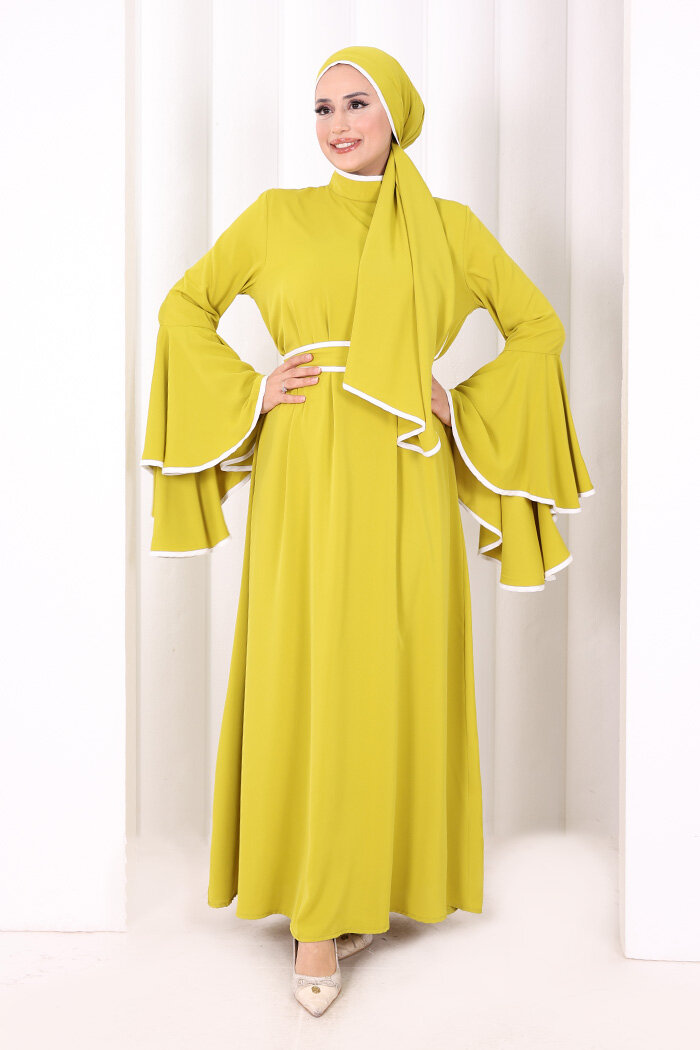 Kol Fırfır Şerit Detaylı Şallı Elbise 6084 Yağ Yeşili