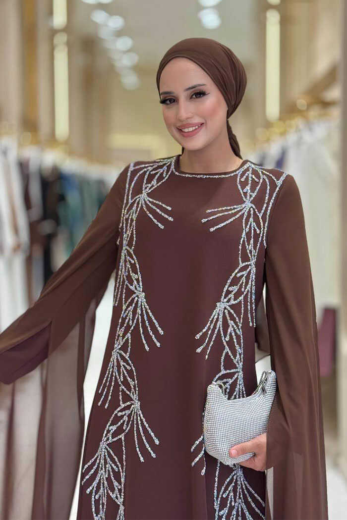 Kolları Pelerinli Taş Detaylı Abiye Elbise 3958 Kahverengi