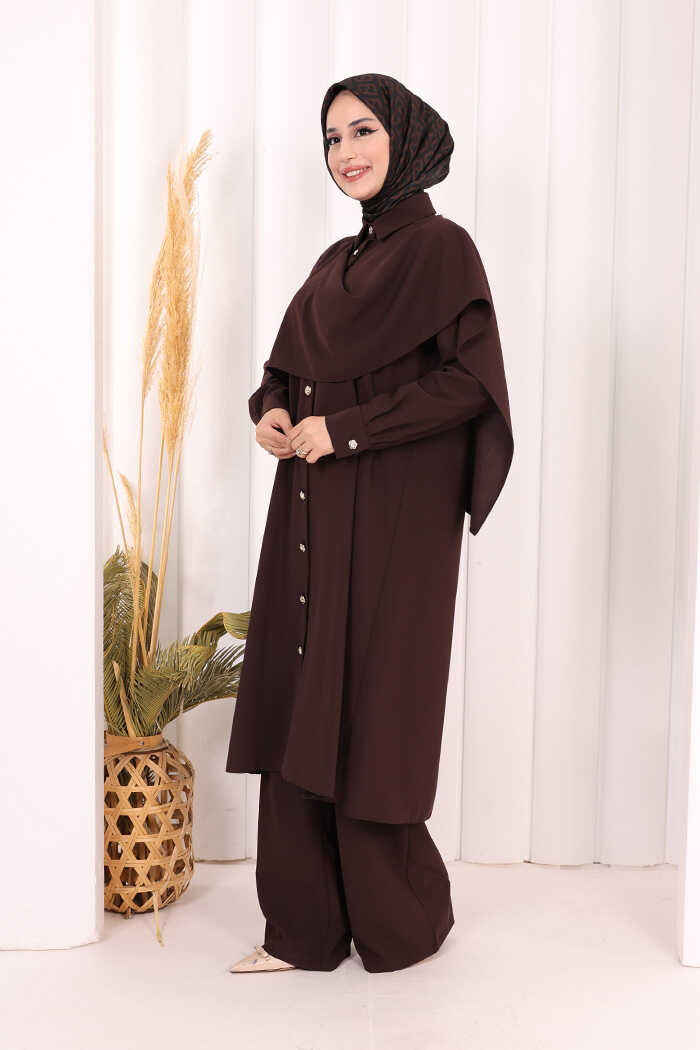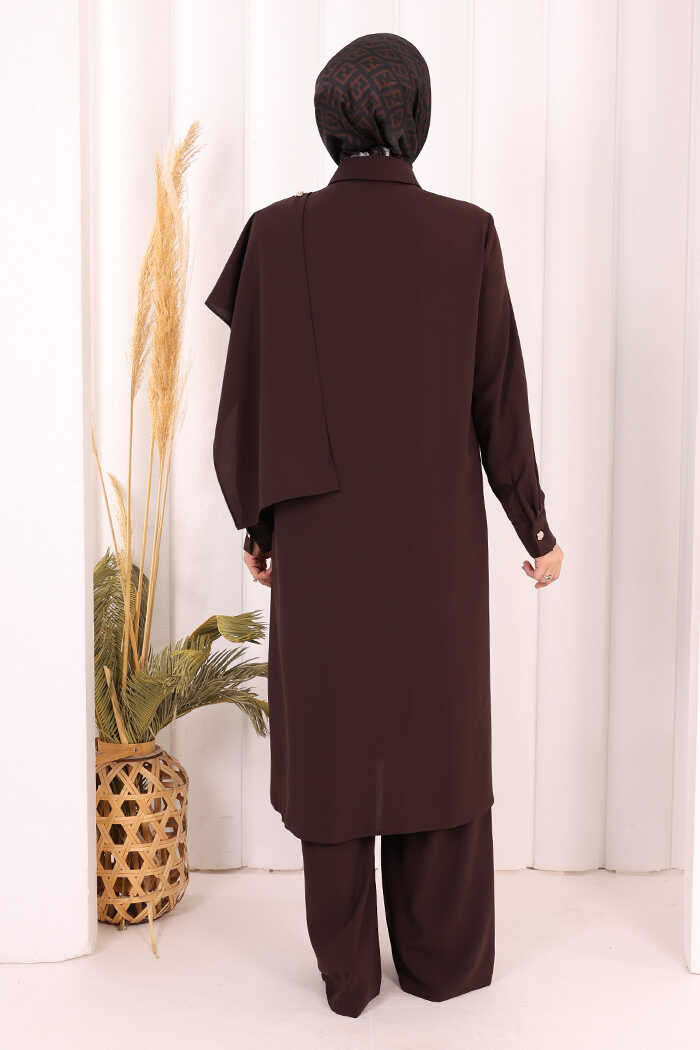 Önü Şal Detaylı Tunik Pantolon Takım 8018 Kahverengi