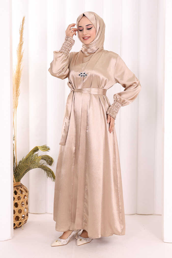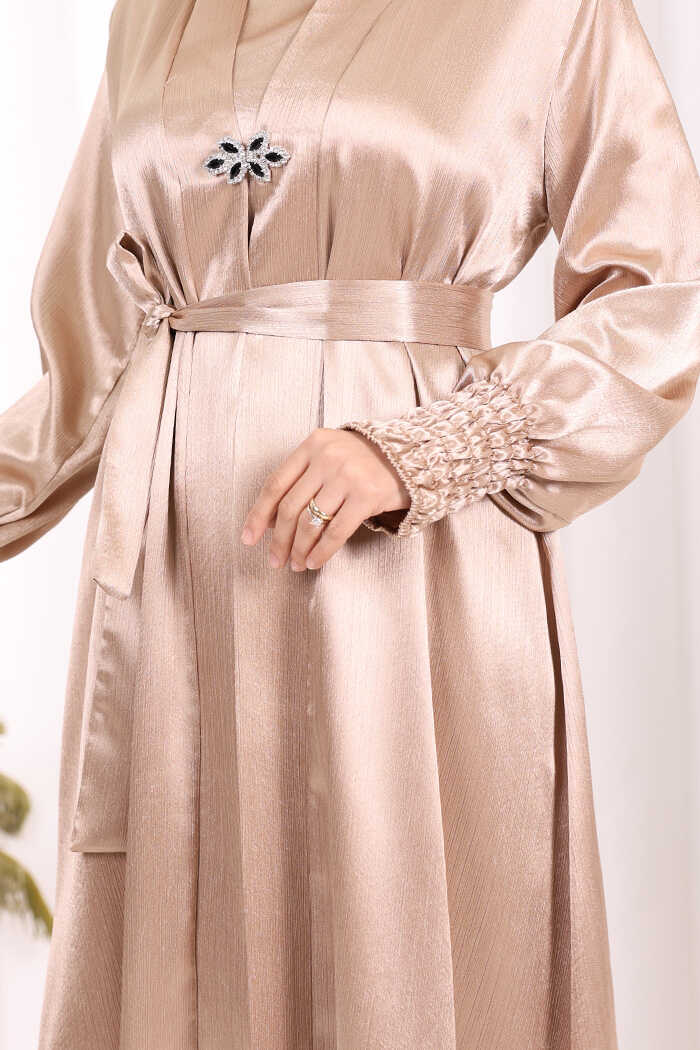 Şallı Elbise Broşlu Abaya Takım 7055 Vizon