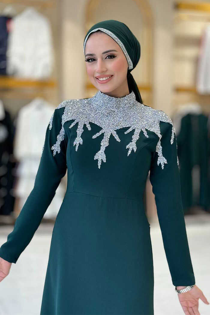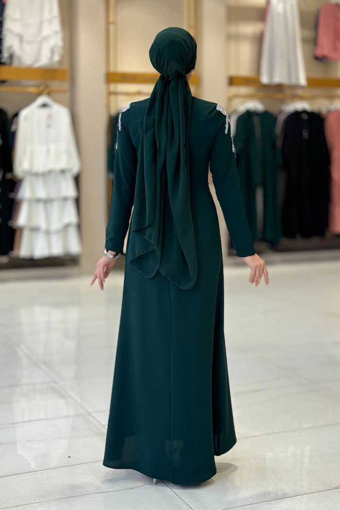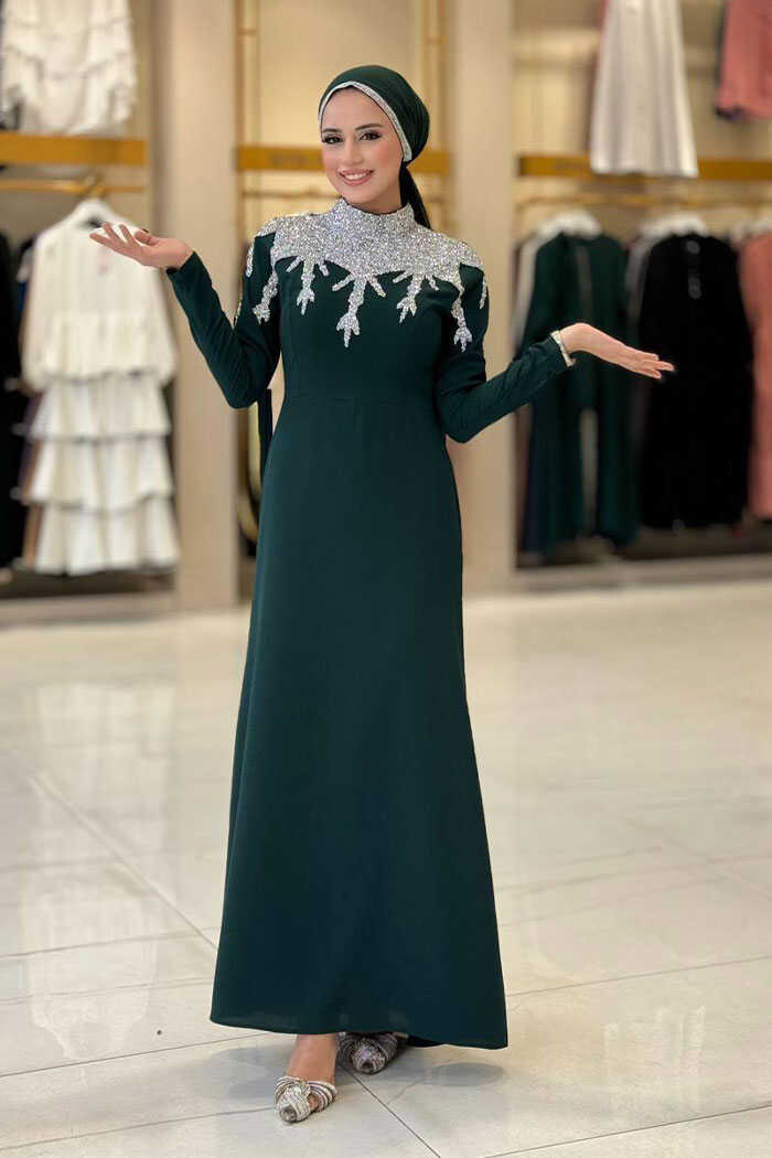 Taş Detaylı Abiye Elbise 3916 Zümrüt