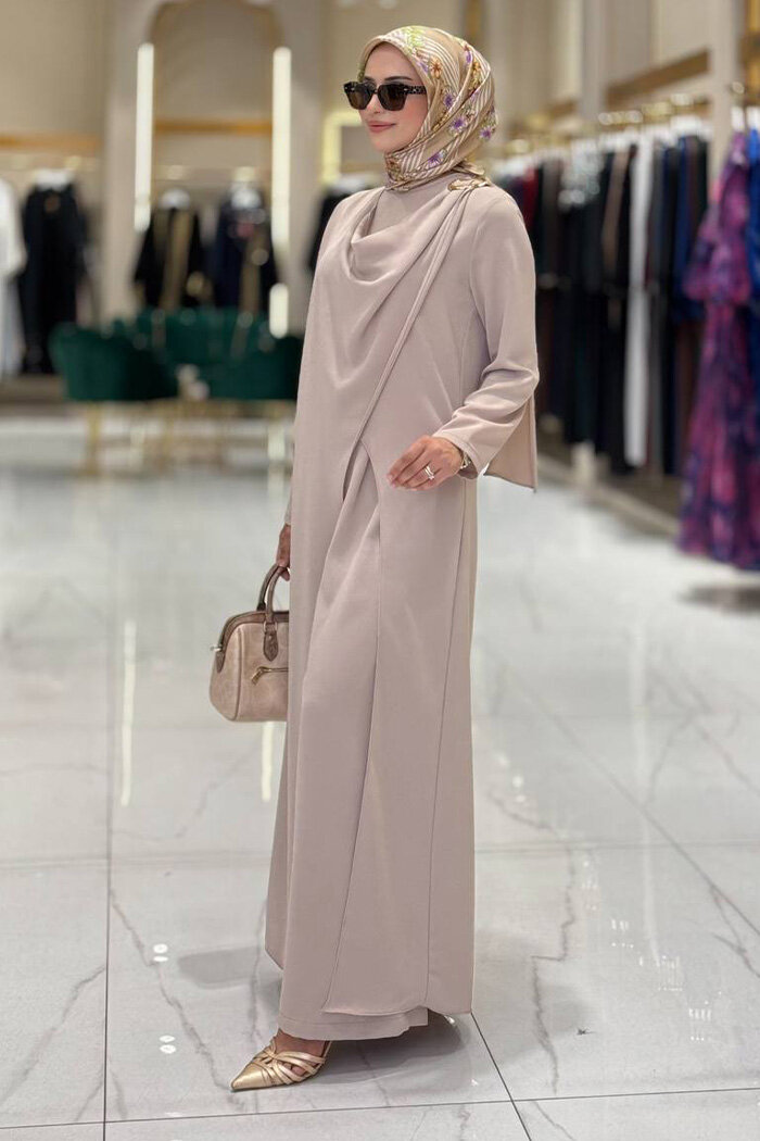 Tek Omuz Gold Toka Detaylı Tunik Pantolon Takım 8698 Açık Vizon