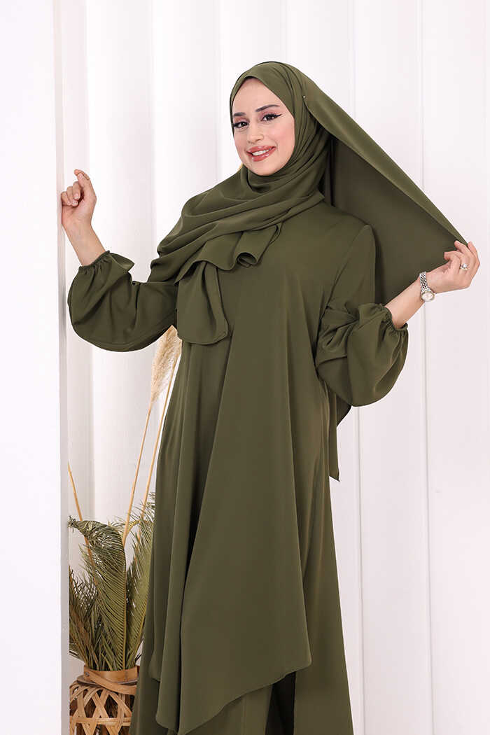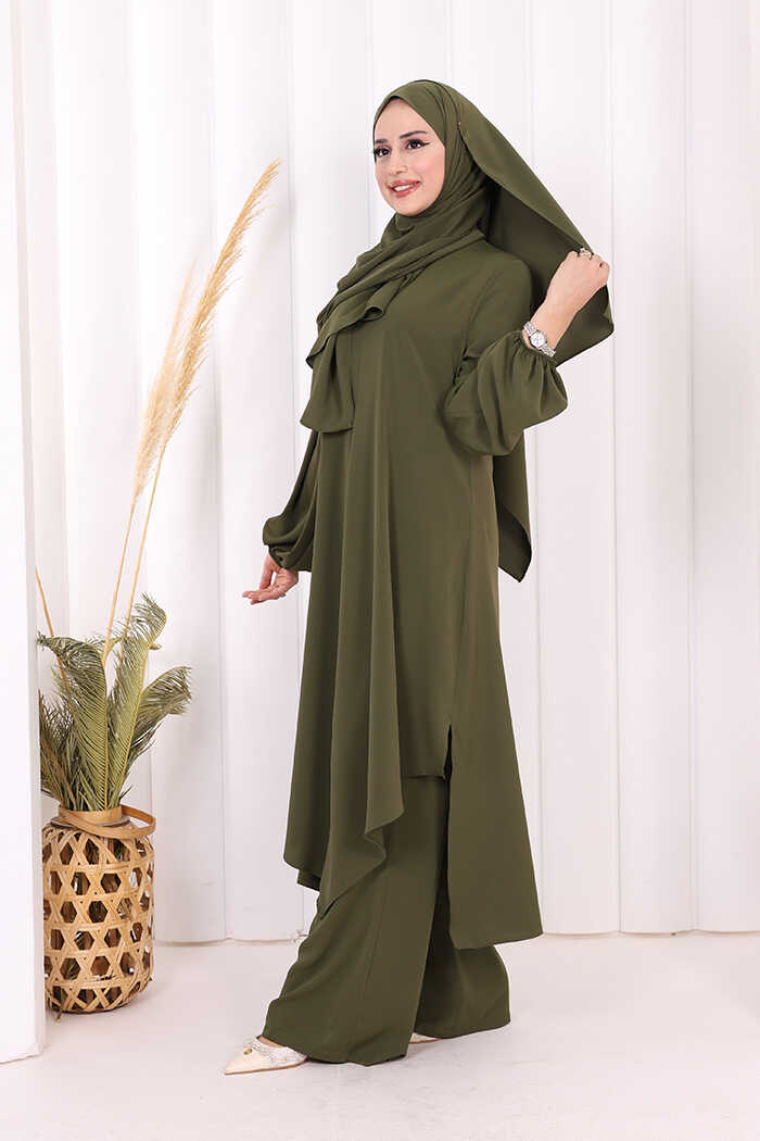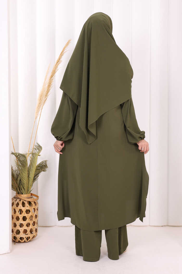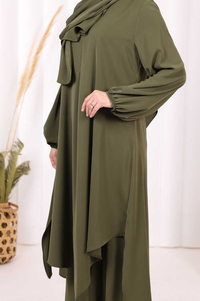 Şal, pantolon ve tunik olmak üzere 3 parçadan oluşmaktadır.