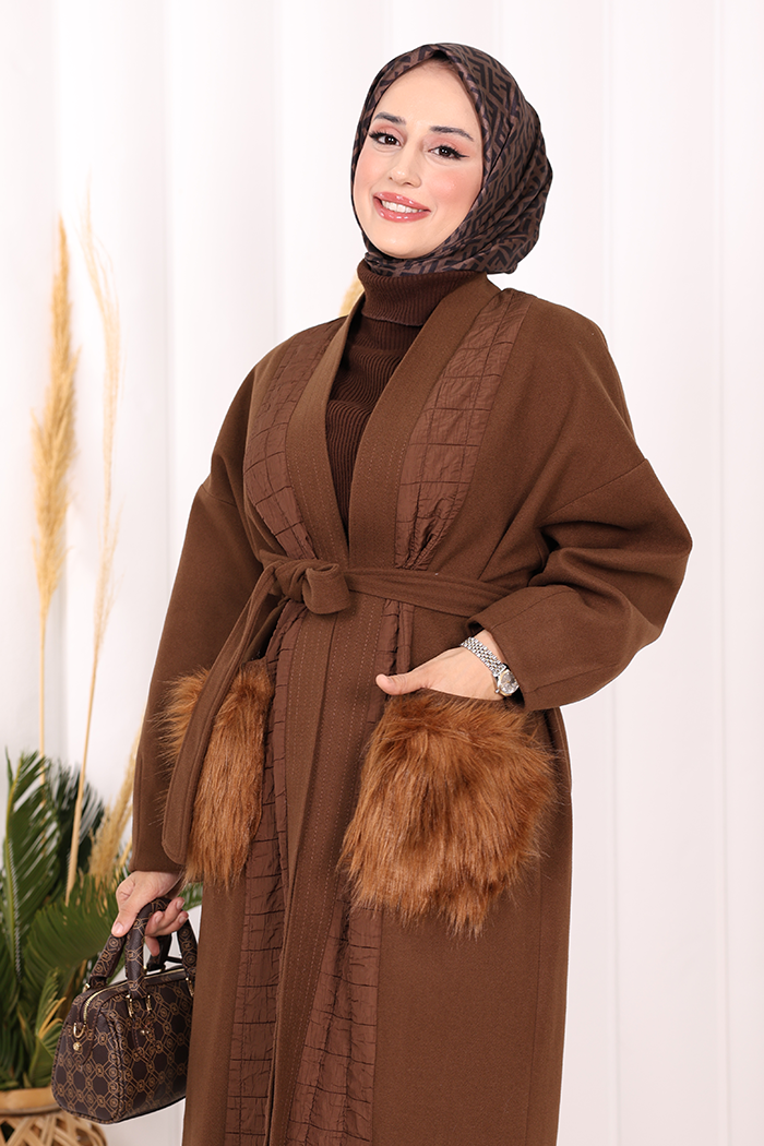 Tüylü Cep Detaylı Bel Kuşaklı Kaban 7865 Kahverengi