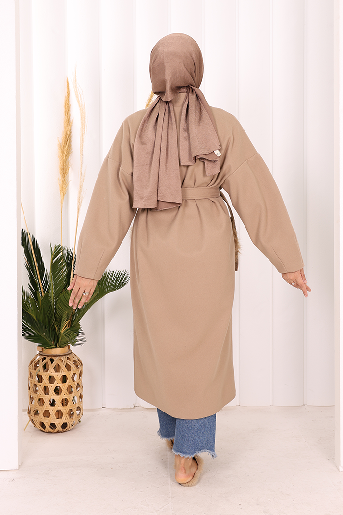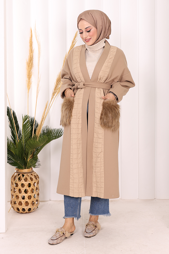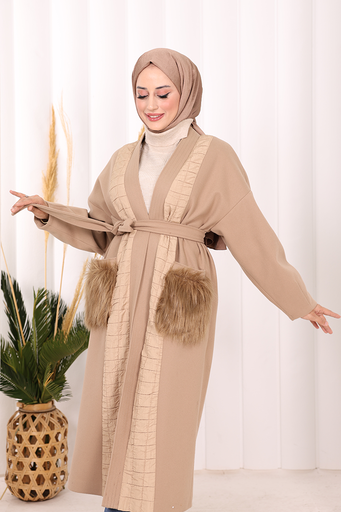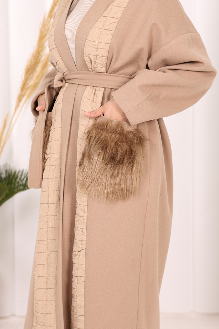 TÜYLÜ CEP DETAYLI BEL KUŞAKLI KABAN: