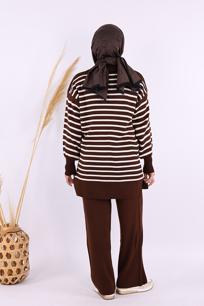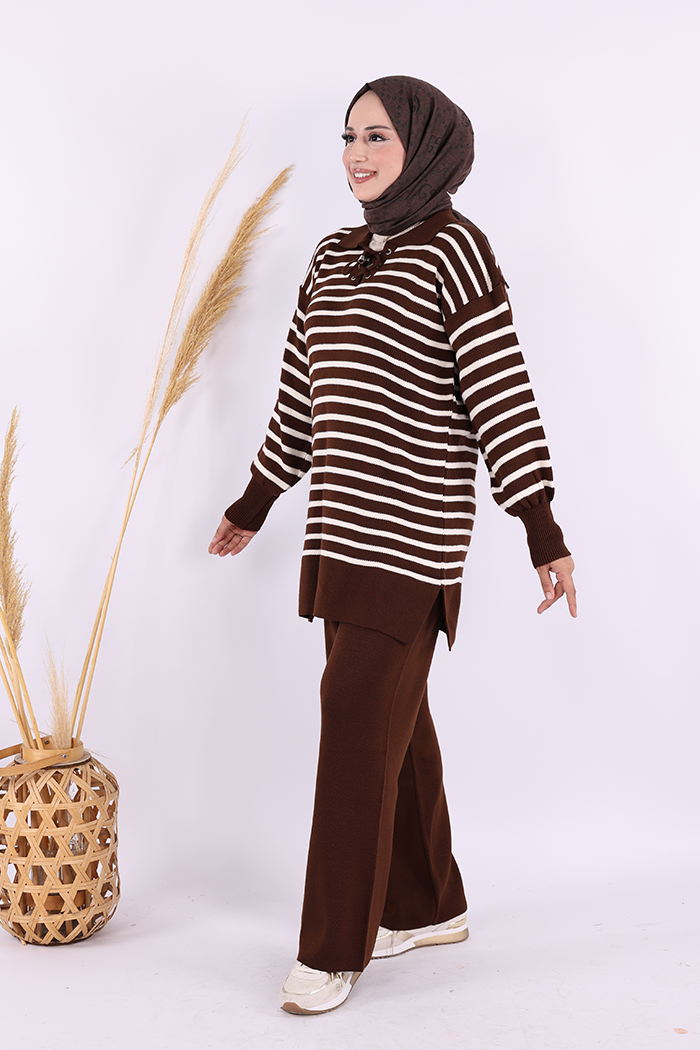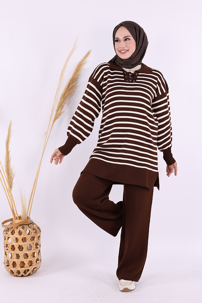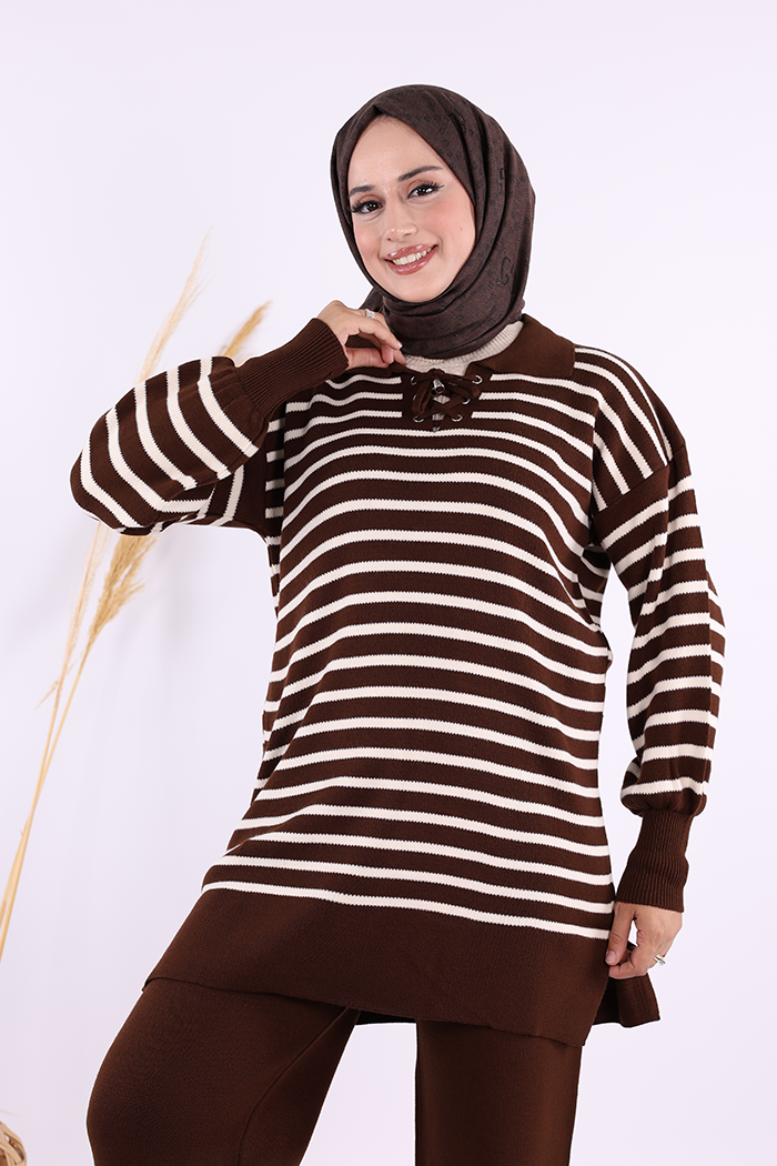 Yaka Bağlama Detaylı Tunik Ve Pantolon İkili Triko Takım 2-1515 Kahverengi