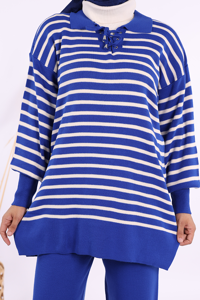 Tunik çizgi desenlidir, pantolon düz modeldir.
