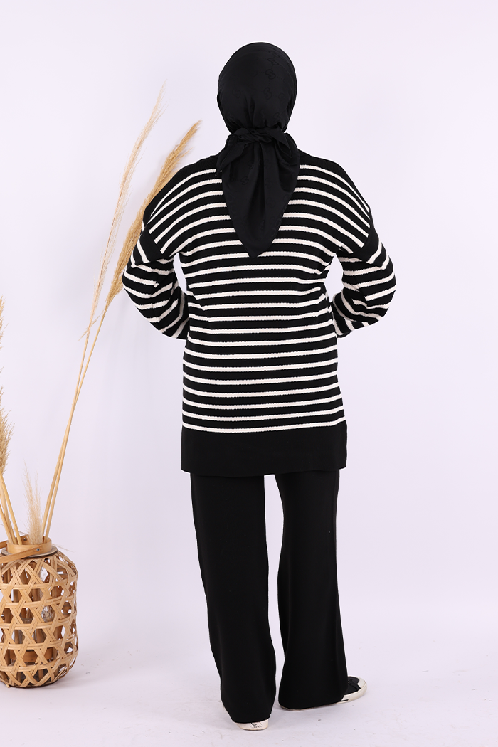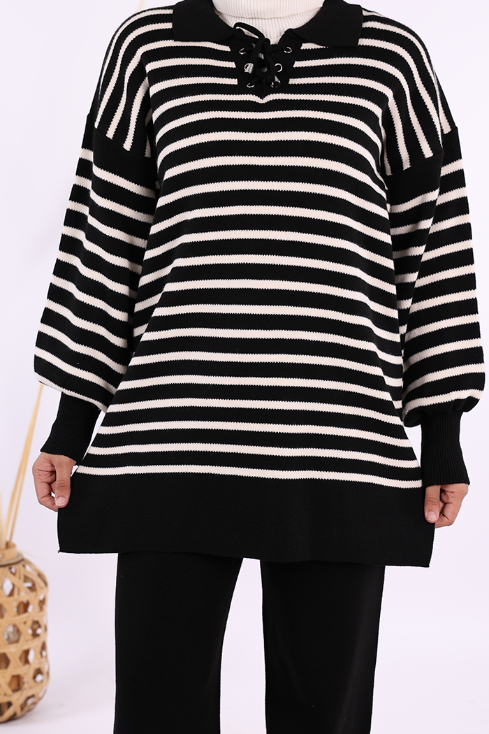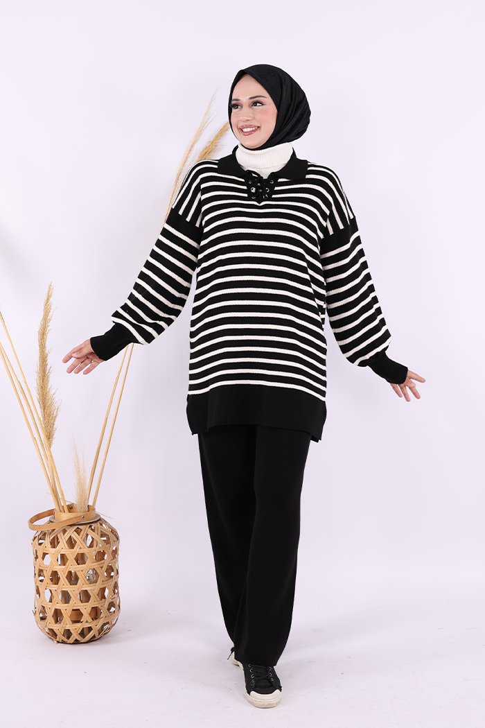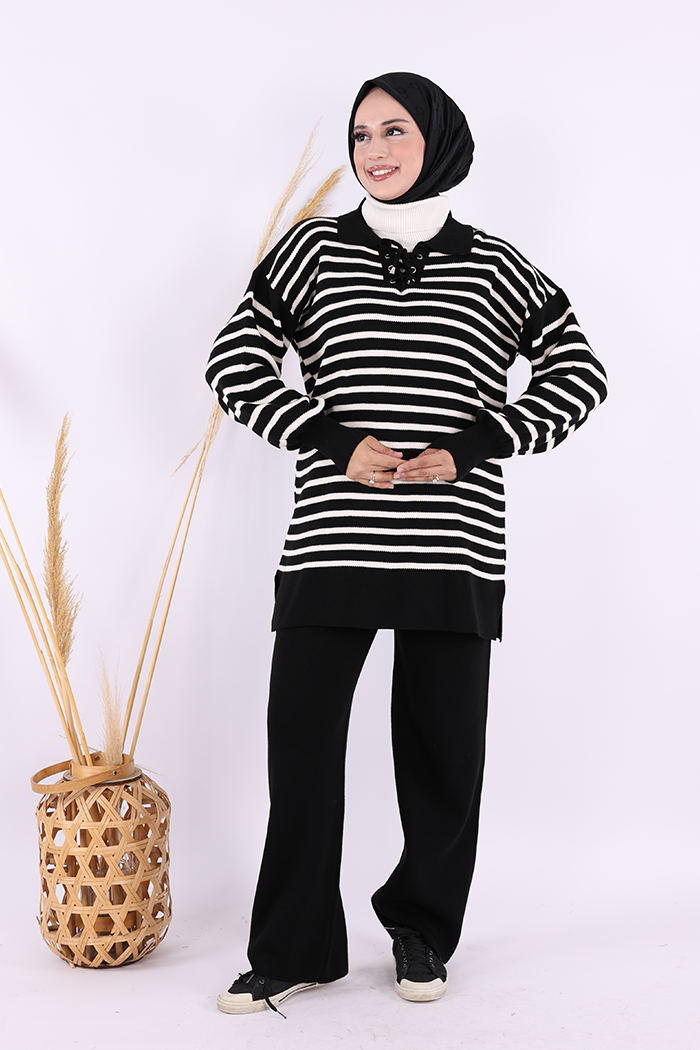 Yaka Bağlama Detaylı Tunik Ve Pantolon İkili Triko Takım 2-1515 Siyah