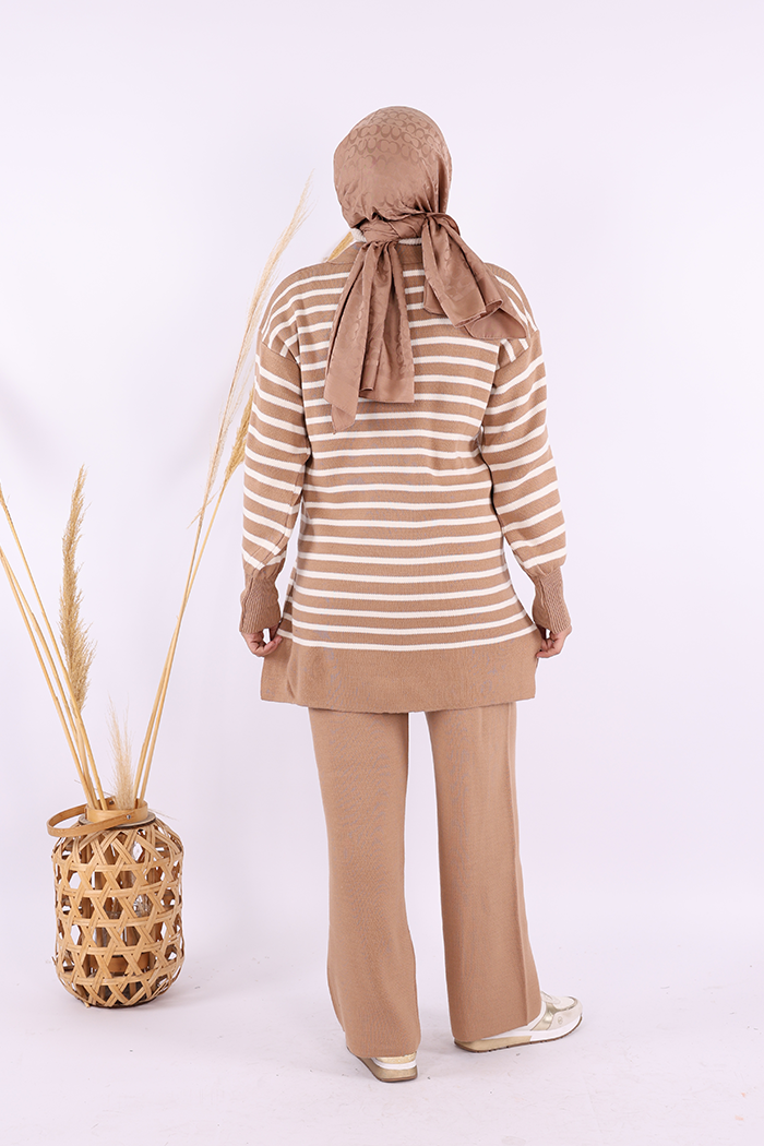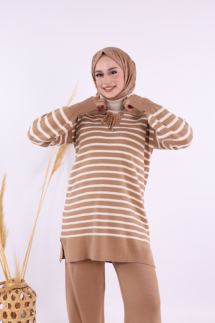 Tunik çizgi desenlidir, pantolon düz modeldir.